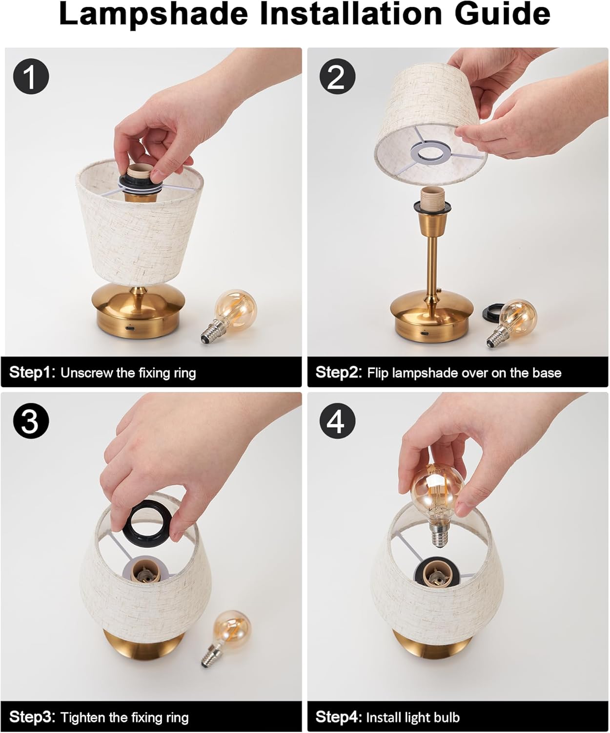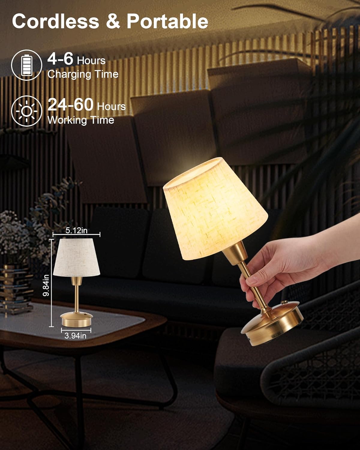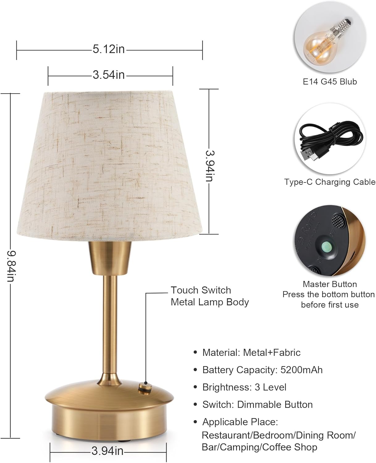 Product Usage Ambient Lighting, Accent Lighting, Table Lighting Applicable Settings Restaurants, Bars, Areas without Outlets, Corners, Outdoor Spaces, Power Outages Style Minimalist Material Fabric Lampshade, Antique Brass Finish Metal Base Power Input 5V-2A Control Method Touch Control Color Temperature 2700 Kelvin Brightness 150 Lumen Included Components Dimmer, Bulb, Battery, Power Cable, Shade, On-Off Switch Package Includes 1 x Lamp (Bulb Included), 1 x Charging Cable, 1 x User Manual