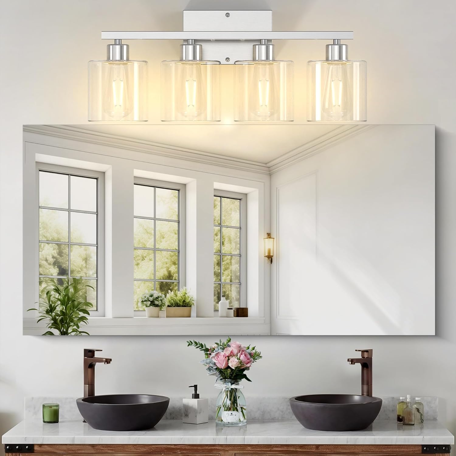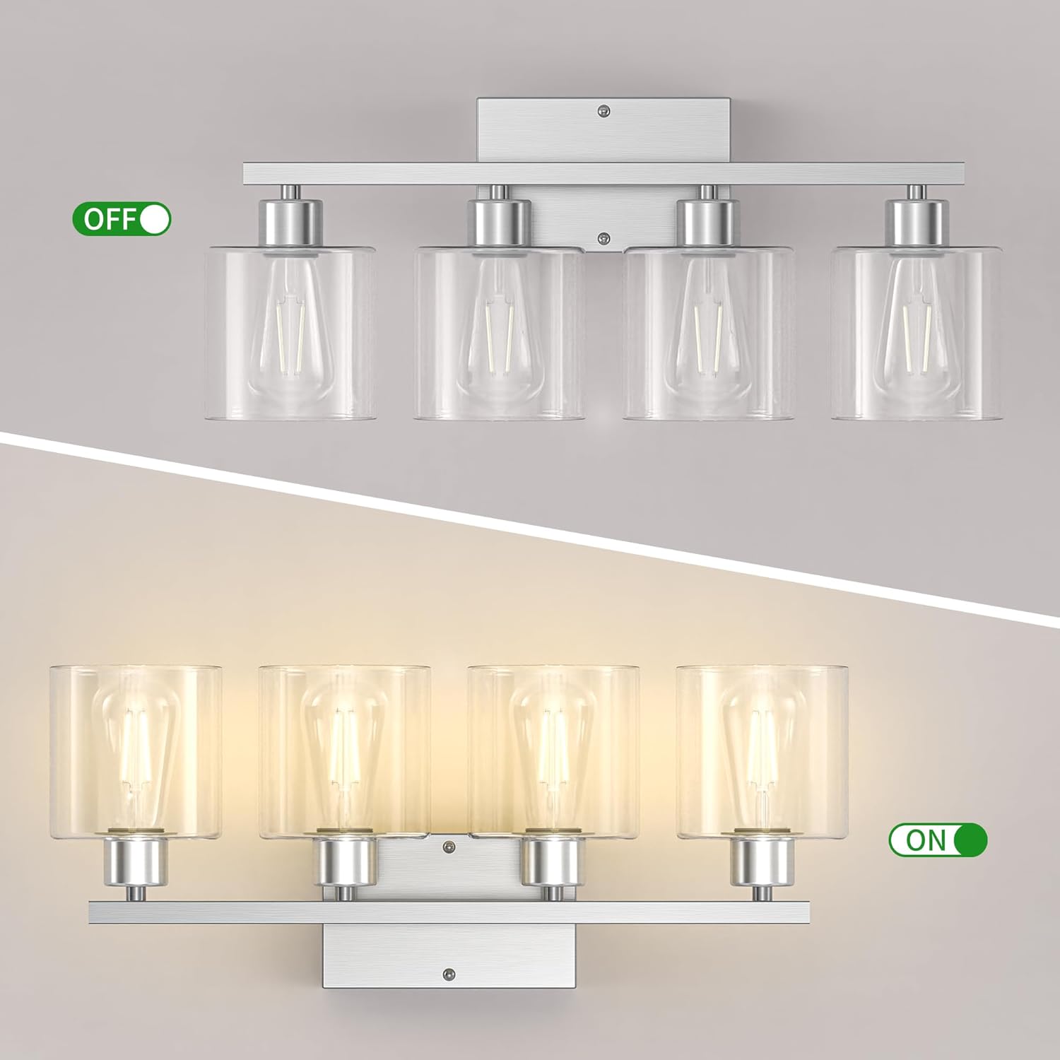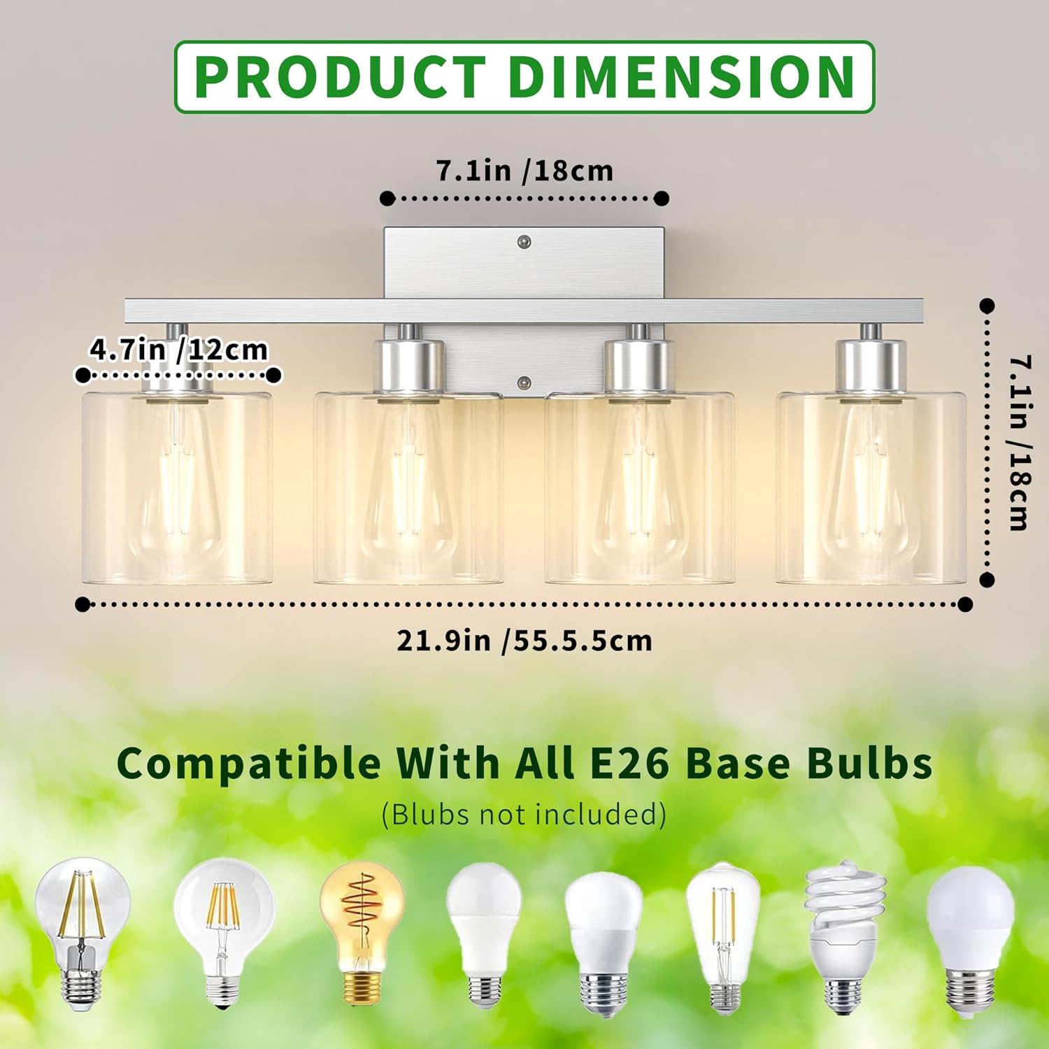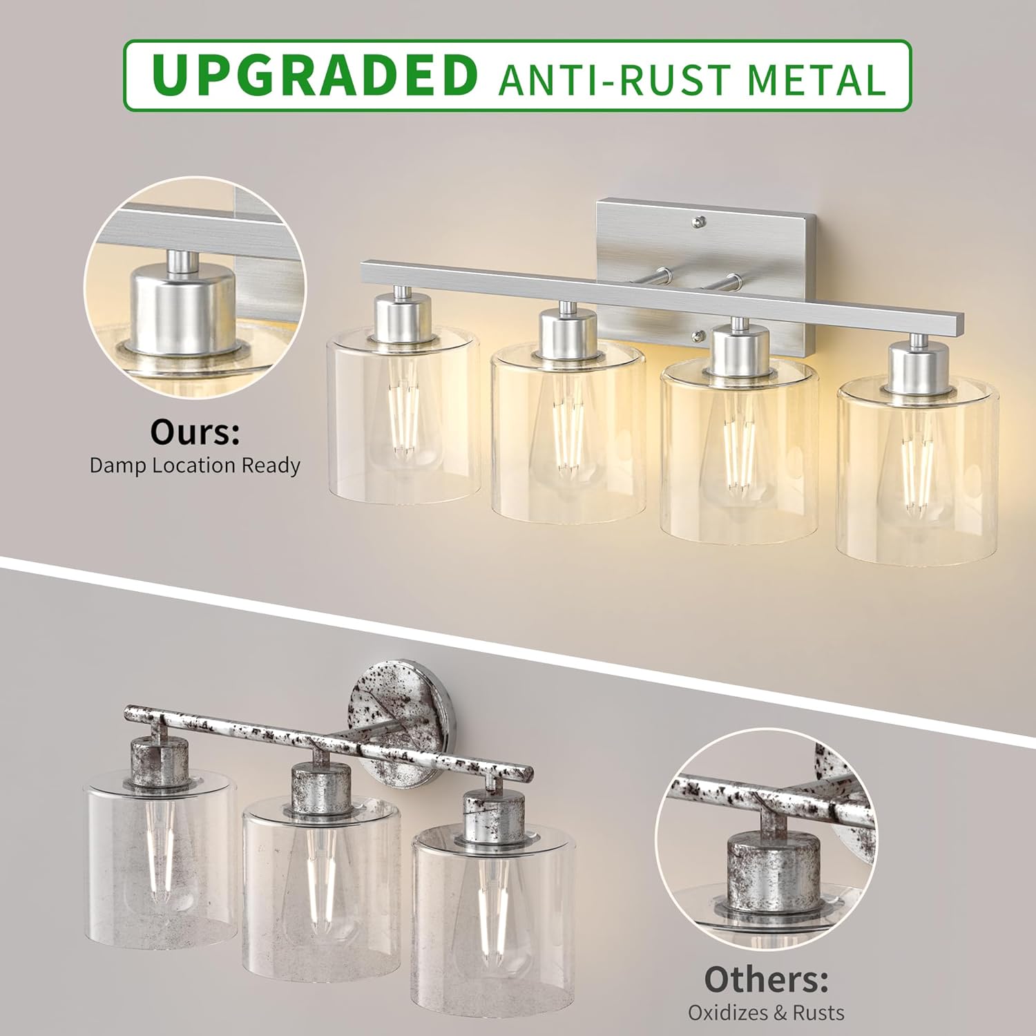 Modern & Durable Bathroom Vanity Light – Stylish & Functional:Upgrade your home with this 4-light modern bathroom vanity light, designed to add a sleek and elegant touch to your space. Featuring a rust-resistant brushed nickel finish and high-quality clear glass shades, this fixture complements any modern, industrial, or Scandinavian decor. Perfect for bathroom mirrors, bedrooms, hallways, and dressing tables, it brings both style and functionality to your home.