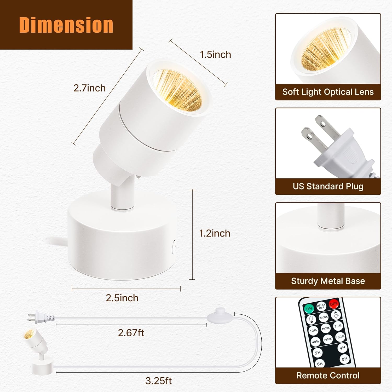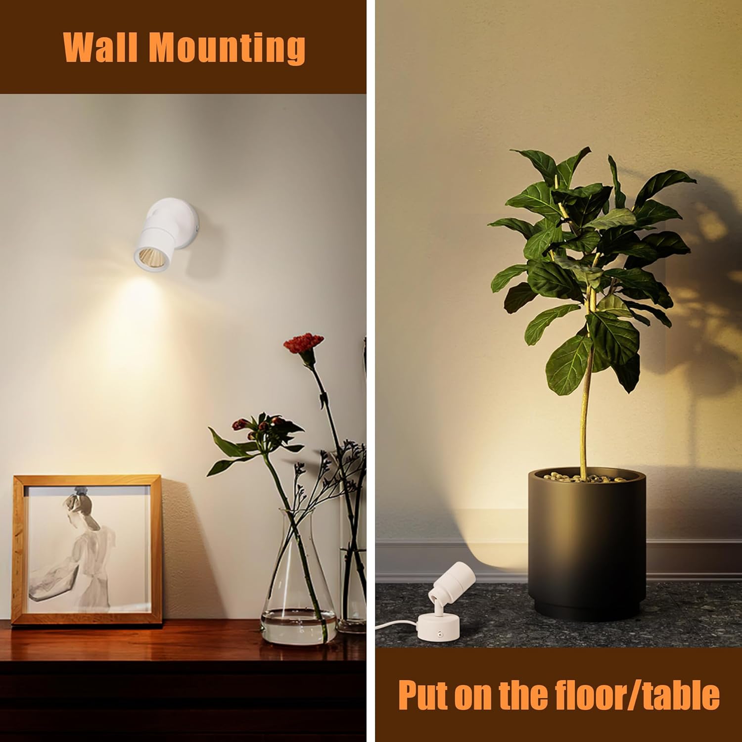 Easy Installation:Mini LED Spotlight is easy to operate, no need to hire an electrician to install it, just plug it in and use it. The indoor spotlight has two mounting options: screwed to the wall/ceiling or directly on the table/floor. Rotates 360 degrees horizontally and adjusts 90 degrees vertically. Compact and minimalist design allows you to place it in any position you like. Especially suitable for lighting paintings, pictures, plant decorations, sculptures, handicrafts, displays, etc