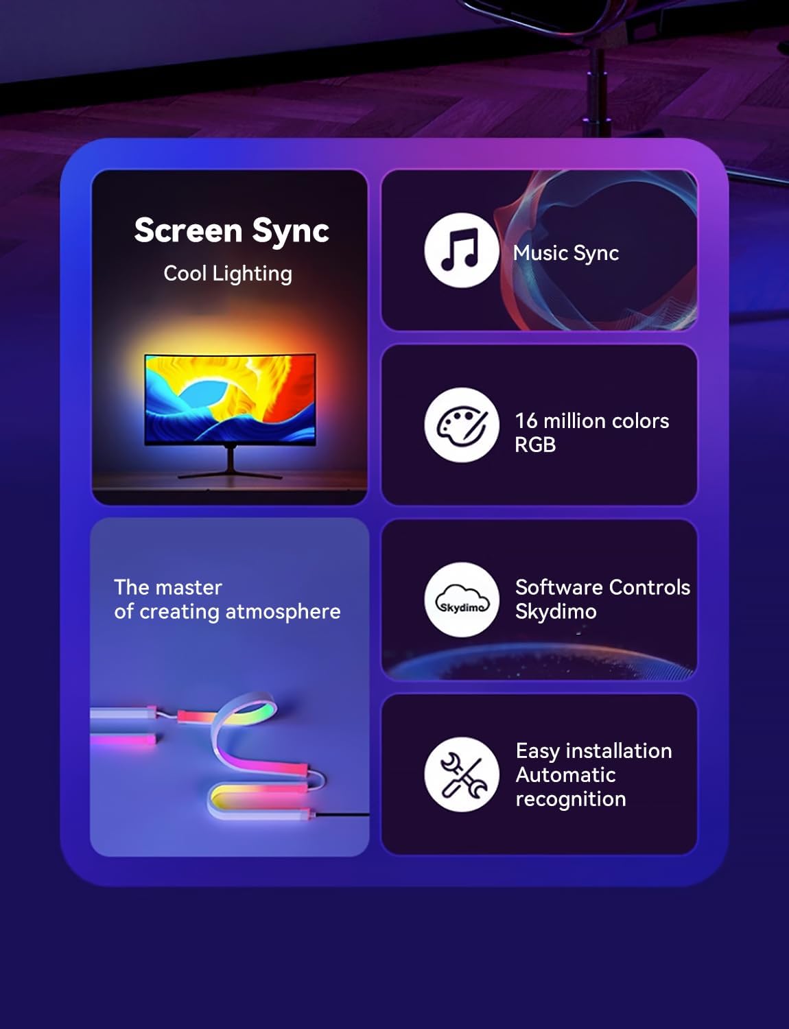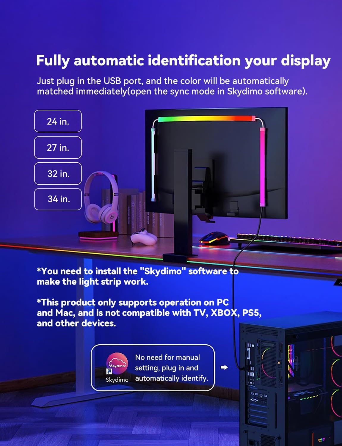 Tip: The light strip only supports PC or Mac , the light sync function needs to be used with “Skydimo” software.