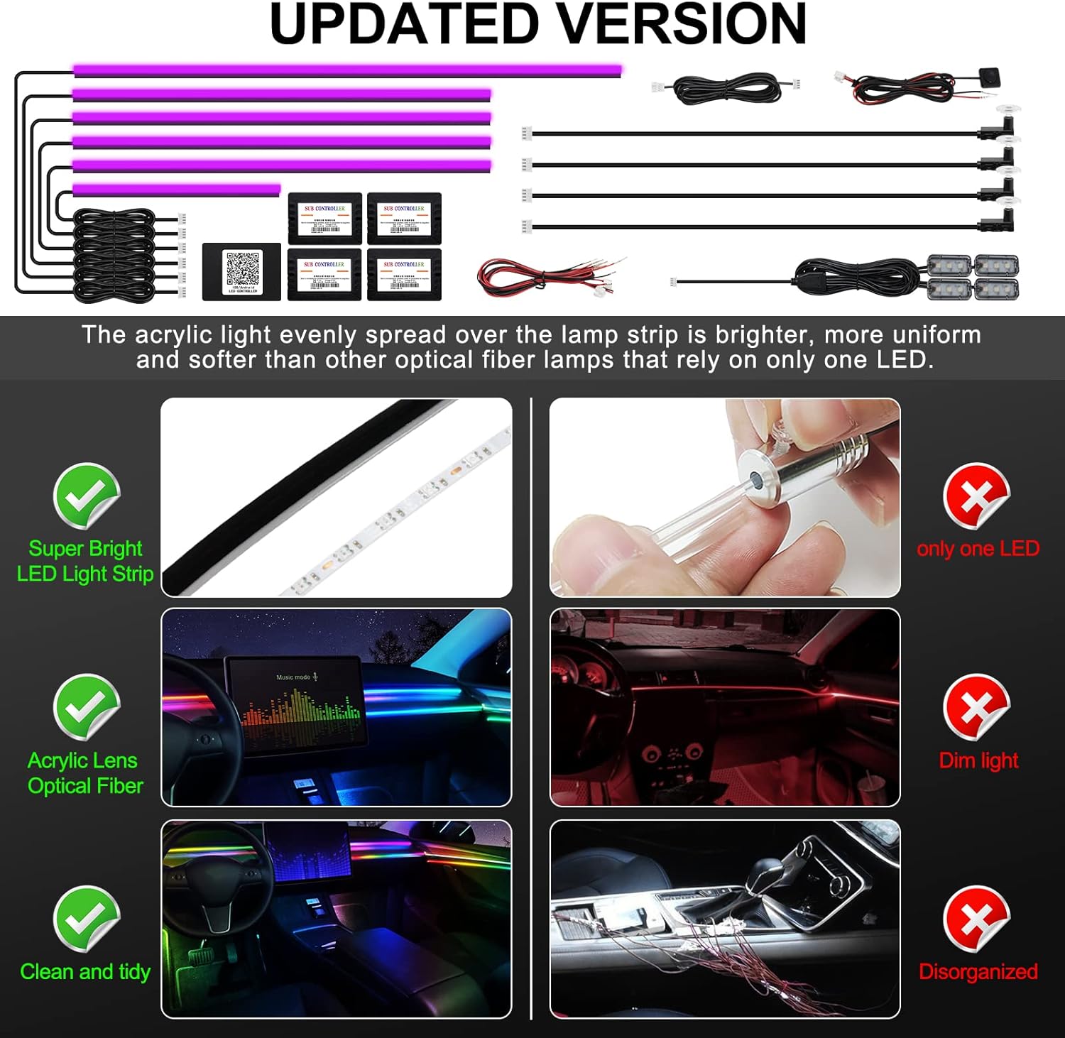 【High Bright & Uniform】The RGB Acrylic Ambient Light Strip have super bright LED and acrylic lens and contains 6 LED strips (4 x 29.5 inches + 1 x 43.3 inches + 1 x 14 inches), Foot well lamp*4(44.5inch*2/64.2inch*2) and Door handle light*4, also comes with 1 main controller and 4 sub controllers,and can be flexibly installed on any car by DIY without disorganized, which is plug and play, and and this acrylic light evenly spread over the lamp strip is brighter, more uniform and softer than other optical fiber lamps that rely on only one LED.