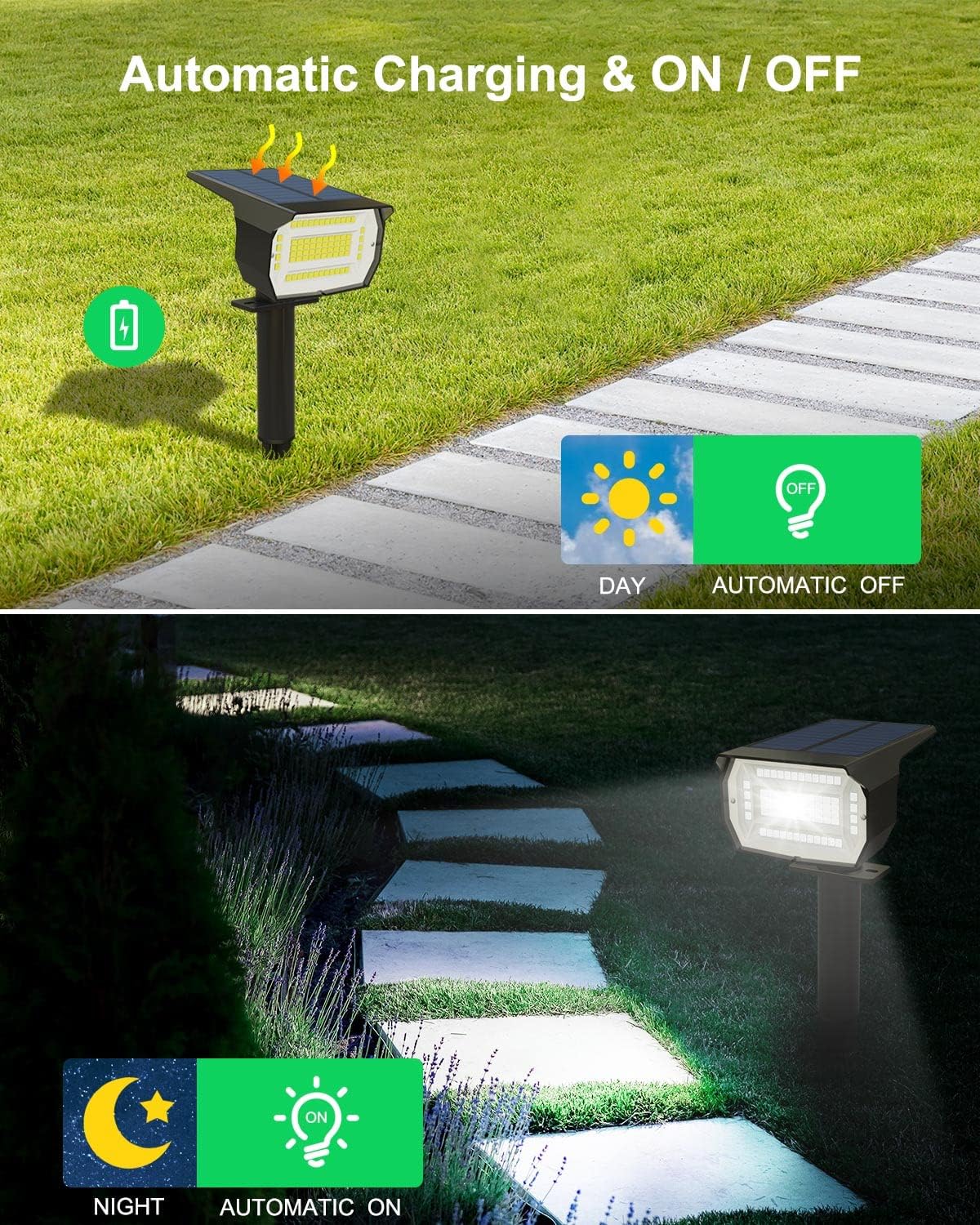 [Ultra-Bright Solar Lights]: Equipped with 72 powerful LEDs,Lotmos solar outdoor spot lights are more durable and illuminate a larger area with perfect brightness and perfect color compared to other 20-40 LED lights on the market.It will be a nighttime light show! Automatically lights up when it gets dark. Really adds life to your trees and illuminates your landscape nicely