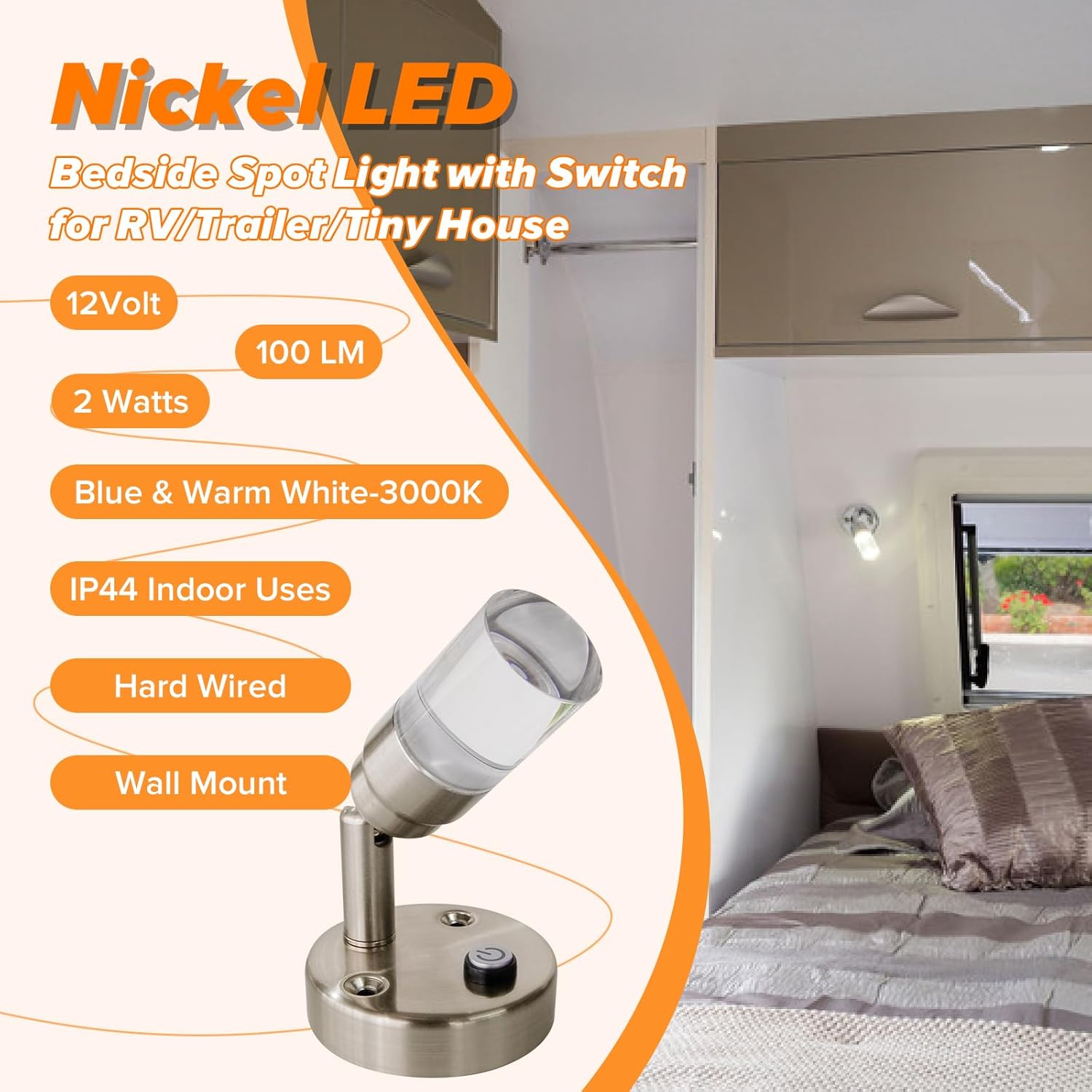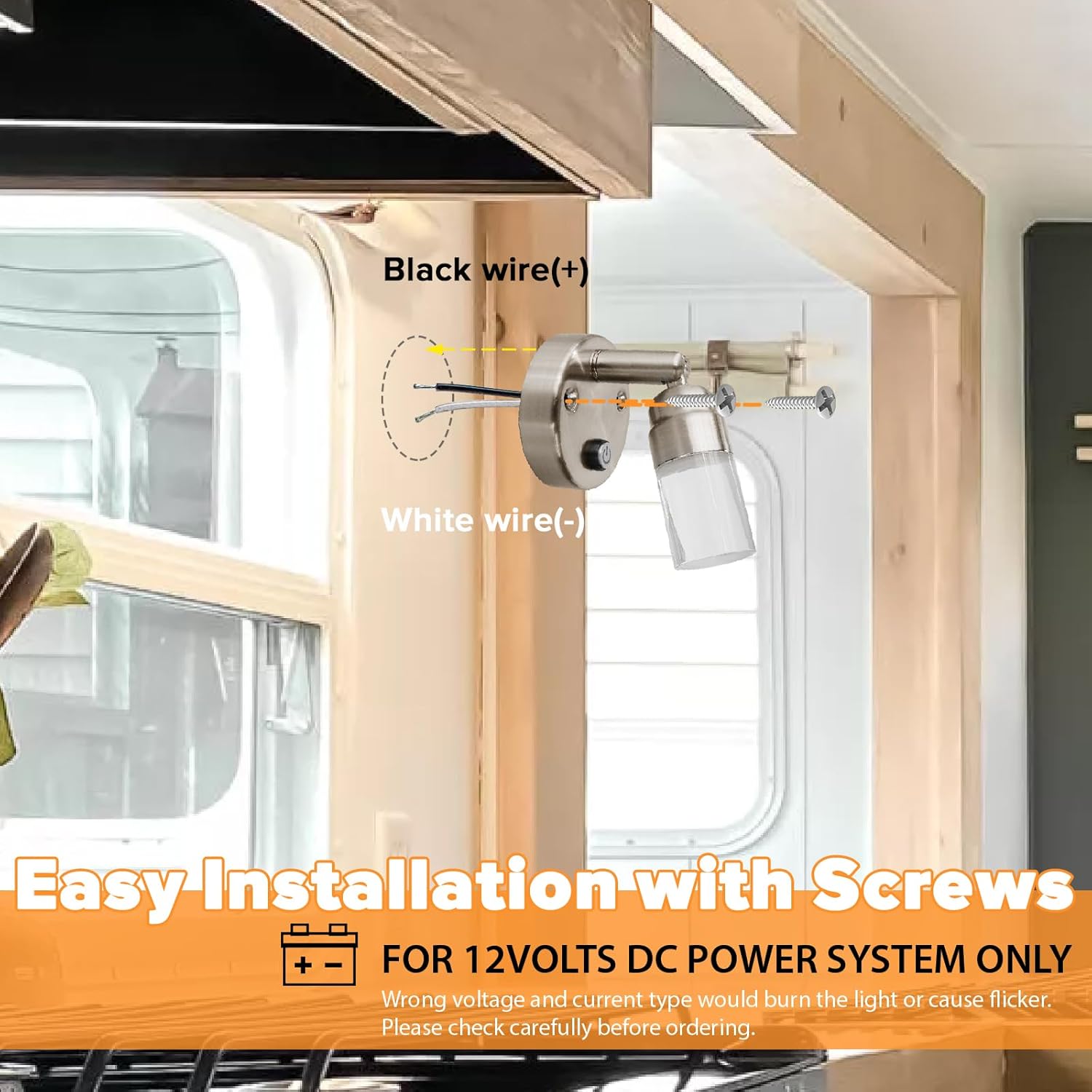 Operating Voltage 12Volt DC Power Consumption 2 watts, 0.14 Amps Lighting Color Blue, warm white-3000K Waterproof Rate IP44 (Indoor uses) Materials Coated steel, acrylic Life Span 30,000+ hours with Switch Yes Dimension 2.3″(L) x 2.3″(W) x 4.6″(H) Screw Holes Distance 1.65 inches (42 mm) Hard Wired Black wire +, white wire -. The length of wire is 8 inches (200mm). Recommended Uses Interior reading light for RV, campervan, morothome, boat. Light Source LED