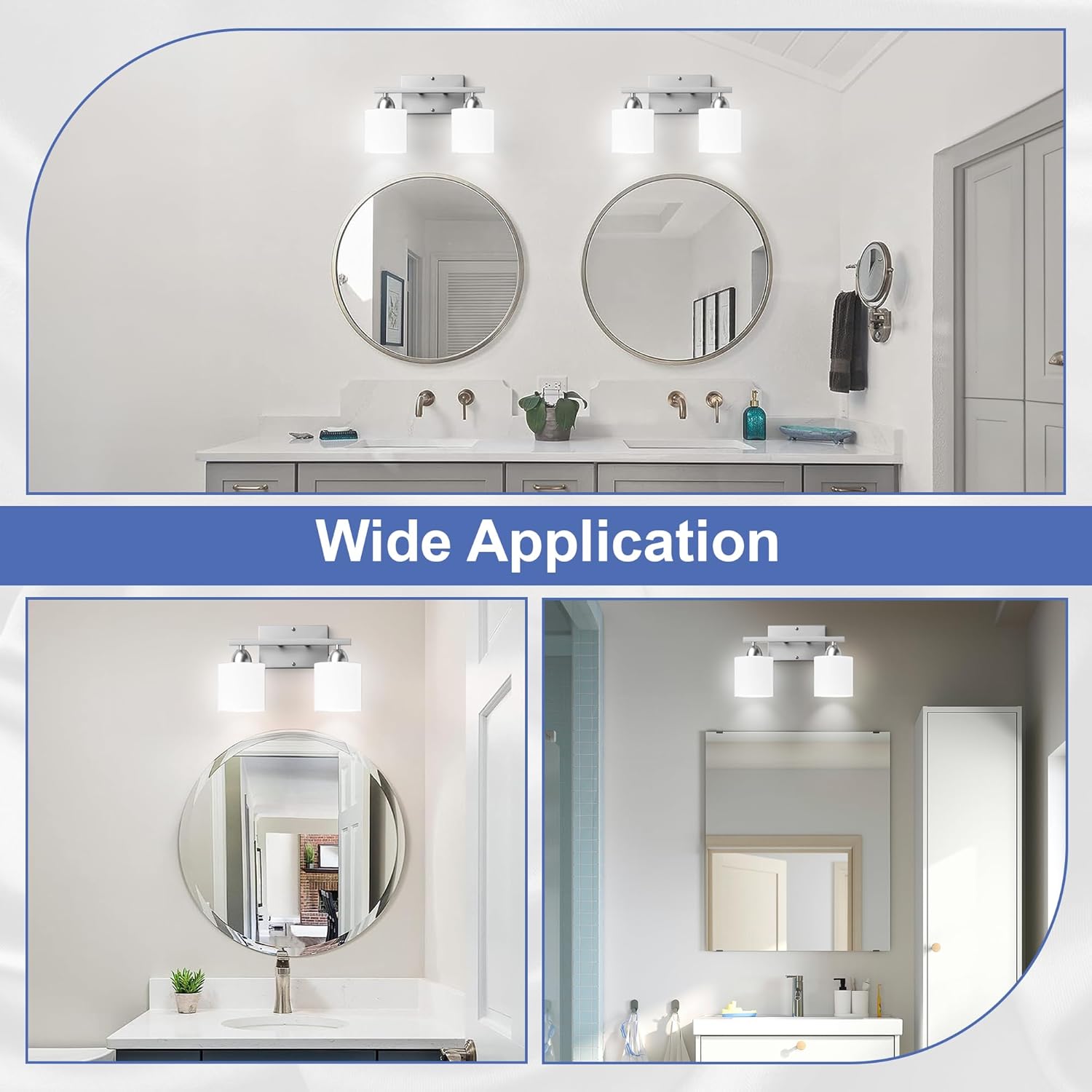 The vanity light fixtures are designed with 2 unique lamp holders and elegant white glass shades to create an antique and minimalist look. Perfect for bathroom, living room, bedroom, hallway, kitchen, porch, staircase, corridor, vanity, mirror cabinets, dressing table, wall sconces, and so on.