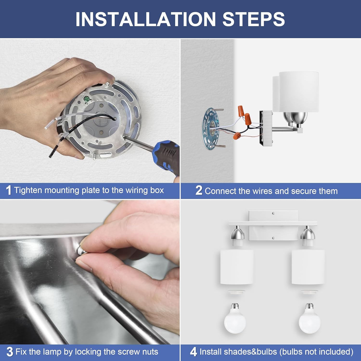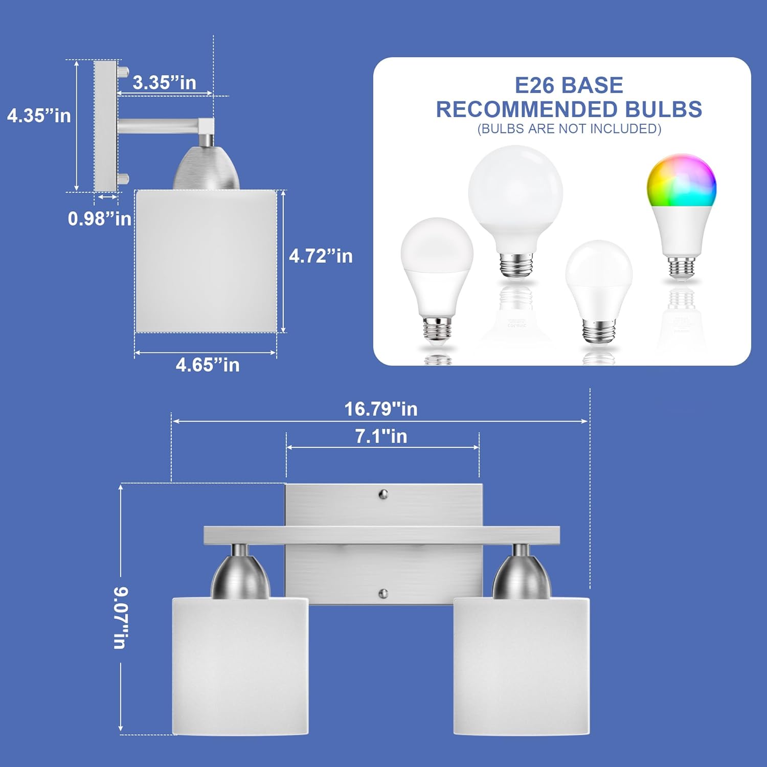 These bathroom vanity lights are compatible with E26 standard base bulbs (MAX 60W, bulbs not included). Any bulbs with E26 base and less than 60w are recommended. Choose the color temperature you love the most to decor your room. (NOT recommended: Bulbs with clear glass lampshade like edison bulbs)