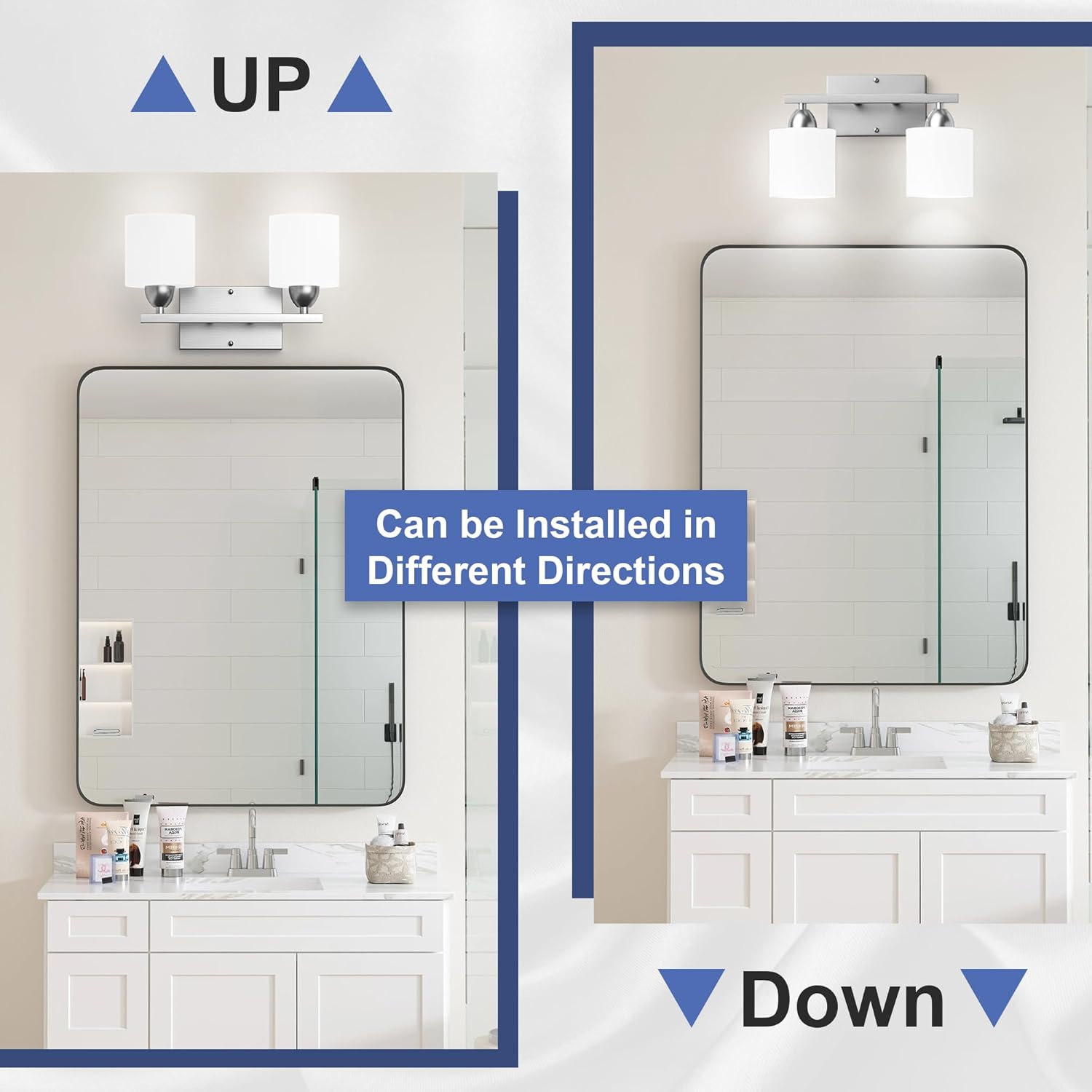 What makes these 2-light bathroom lighting different from others is that they are certified by FC, CE, and ROHS to meet U.S. recognized product safety standards. Safe enough to be used in the damp room like bathroom or bedroom.