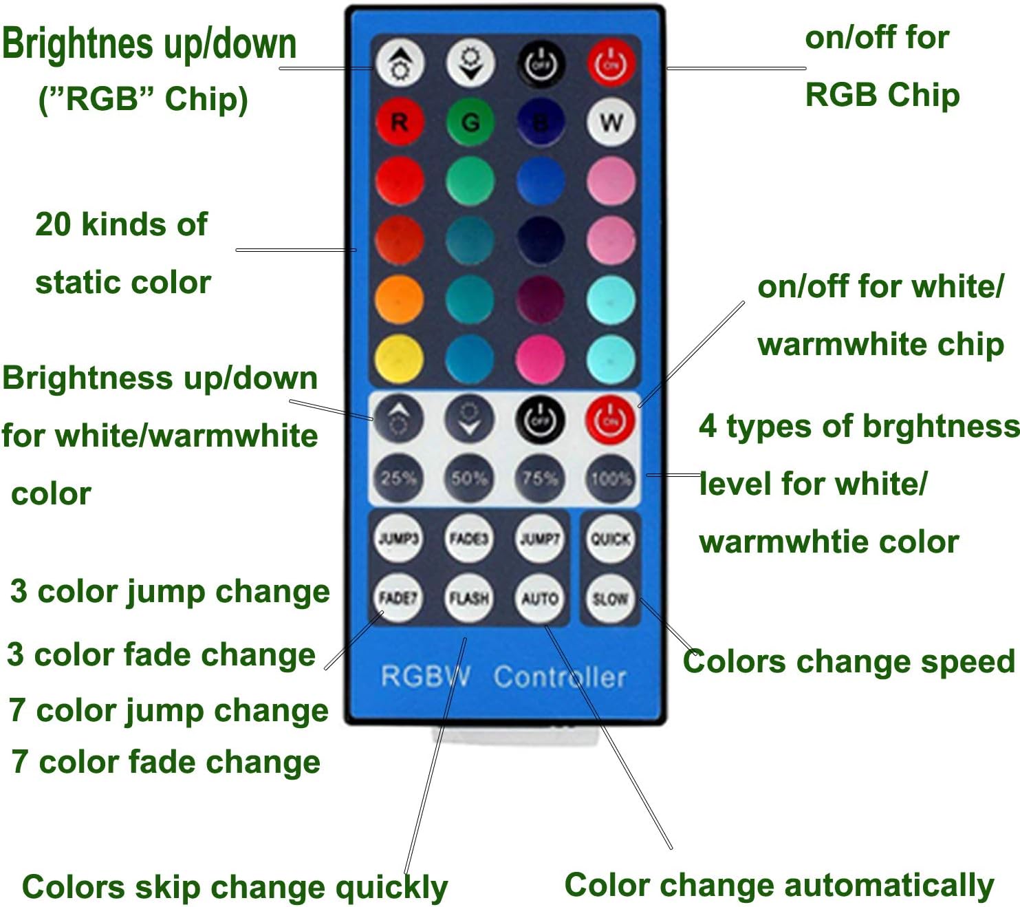 There are two parts of function buttons on the remote. They are static lighting mode buttons & dynamic lighting mode buttons. And the static lighting mode buttons are divided into RGB part buttons & White part buttons.The RGB part leds & White part leds of the puck lights could light up simultaneously while you press two parts of buttons at the same time on the remote.