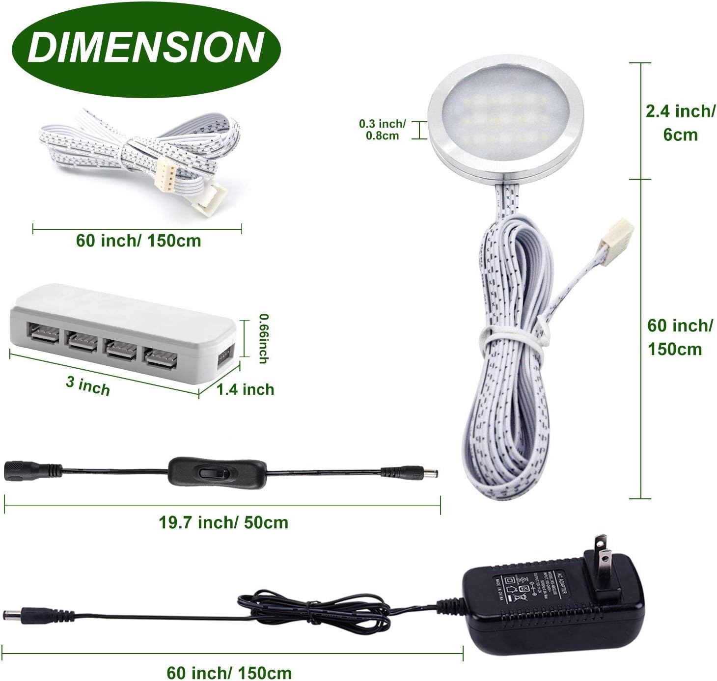 Technical Details Of 6 Puck Lights Kit Input Voltage: AC 120V Output Voltage: DC 12V Wattage: 18W Dimension: D2.3 inches H0.3 inches Material: Aluminum Lumen: 1200LM