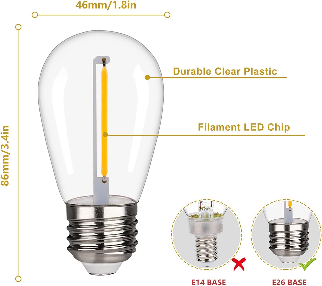 Product Specifications Product Name: S14 LED String light Bulb Model:S14 1W 2200K 15 PACK Waterproof-No Dimmable Bulb Material : Clean Plastic Input Voltage: 120VAC Watts: 1W Luminous Flux: 100lm Color: 2200K Soft White Incandescent lamp Equivalent: 10 watt Base Type: E26 Base Beam Angle: 360 degrees Diameter: 1.8 inches(46mm), Height: 3.4inches(86mm) Lifespan: 30000 Hours Package: 15PACK S14 1W String Light Bulbs