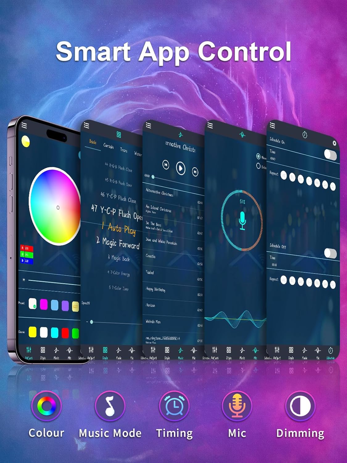 【APP application software control】LED lights for TV have an app application control function that provides a variety of modes and functions to customize your lighting effects, and can also adjust brightness, colour, speed, etc.