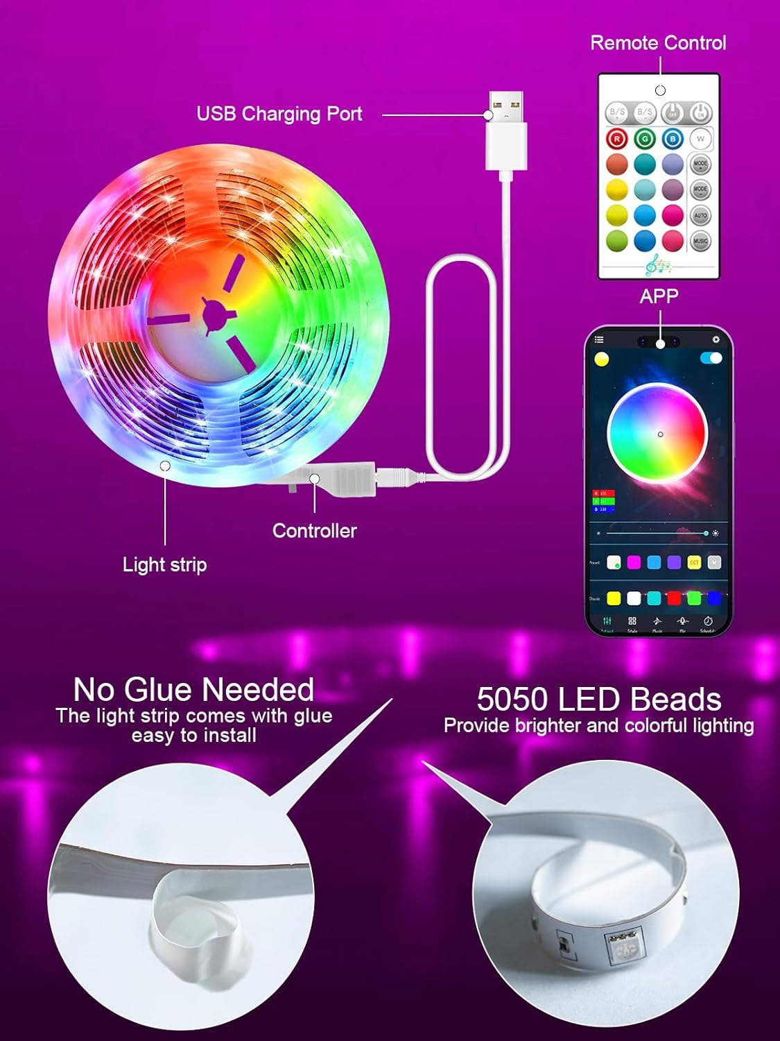 【Range of Application】: From creating the right ambiance for your living room to providing the perfect lighting for indoor venues such as home theaters, our LED strips are the perfect choice. Securely powered by a 5V USB power supply.