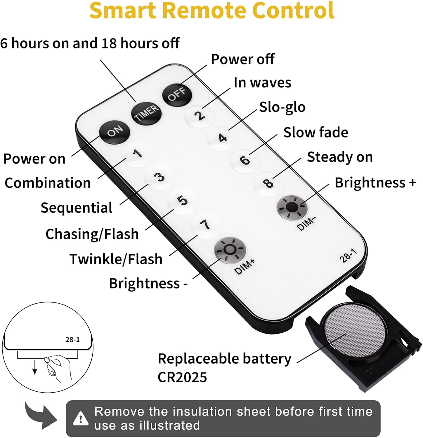 Timer Functions and 8 Mode Lights: The rv globe lights have 8 lighting modes, namely combination, in waves, sequential, slo-glo, chasing or flash, slow fade, twinkle and flash, and steady on. The rv outdoor lights also have a memory function allowing you to set your specific mode and use the timer function on the remote to turn on the lights for 6 hours and off for 18 hours automatically every day.
