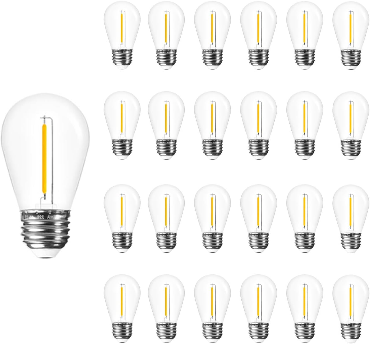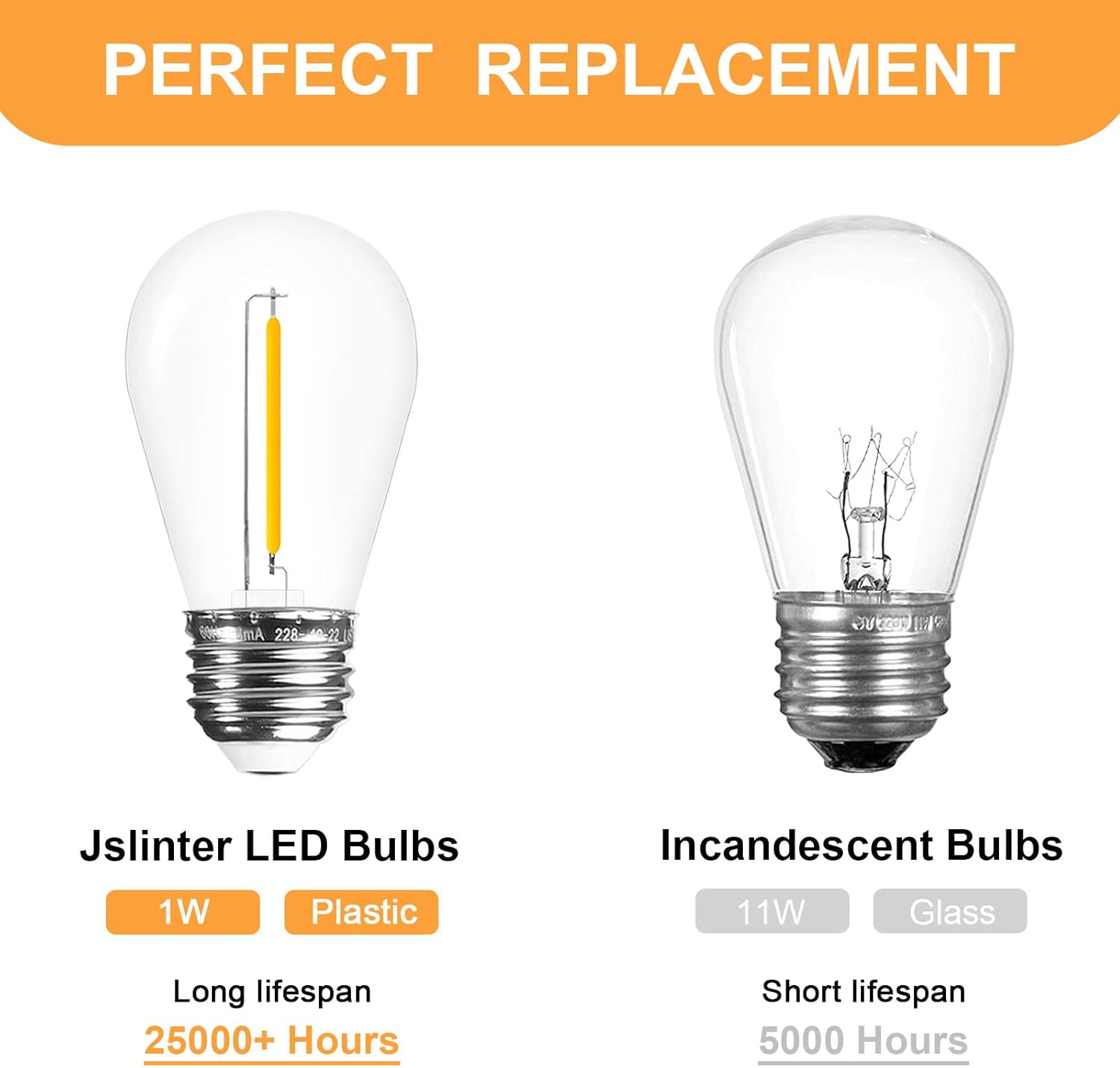 These Jslinter S14 shape LED string light replacement bulbs are in 25 packs, super convenient to have at hand. Perfect to replace 11W incandescent bulbs. Their Edison-inspired exposed filaments add extra beauty to the bulb shape.Our commercial-grade plastic string light bulbs adopt premium materials that meet the requirements of outdoor usage all year round. And they don’t yellow over time. All our LED patio light bulbs have gone through the strictest quality control process to rule out quality issues. Each bulb is individually packed to avoid scuffing during shipping.