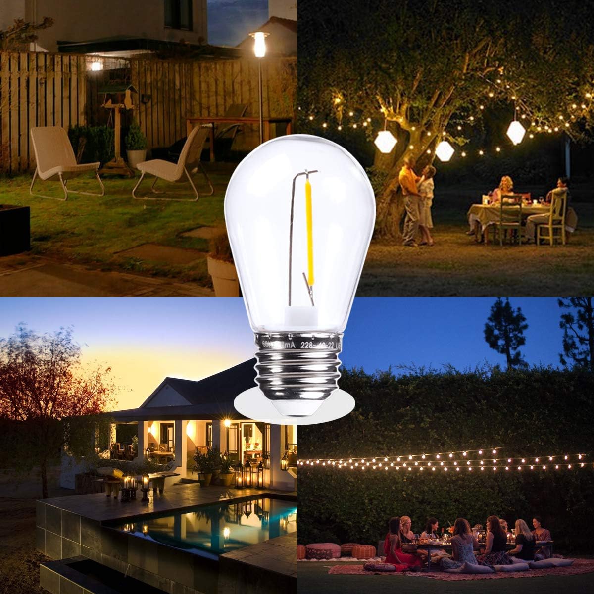 With exposed filaments and clear shell, these outdoor string light bulbs precisely replicate the classic incandescent light bulbs Thomas Edison invented. They look very retro and festive. Sharp, clean and clear, simply beautiful light to make your area cleaner, fresher and more enjoyable.