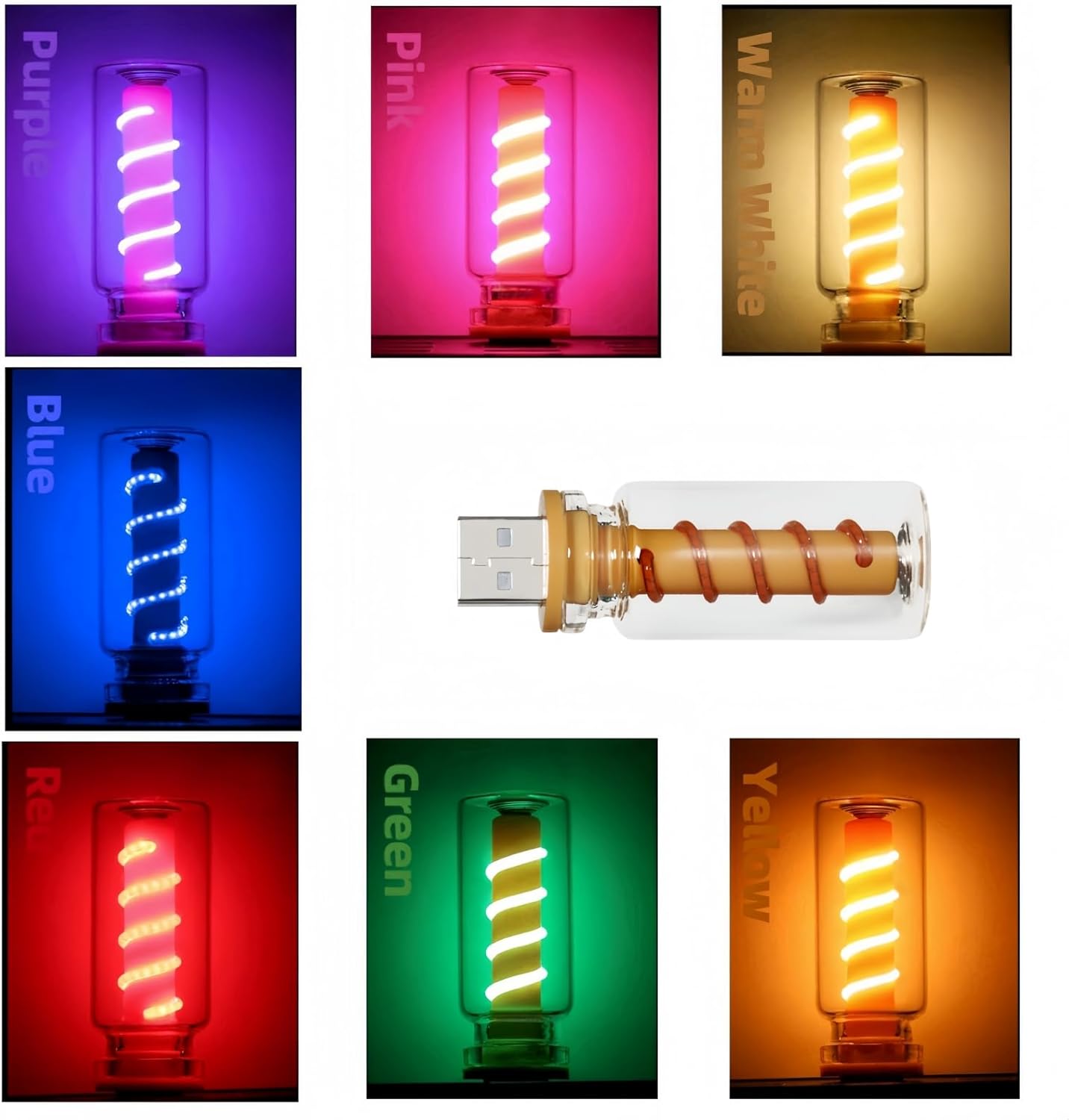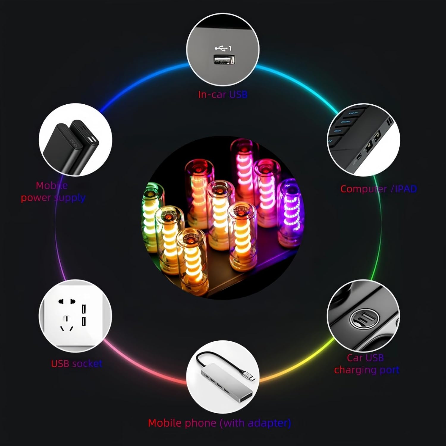 Elevate any space with this energy-efficient and durable LED ambient lighting solution. Featuring a retro 3D design with transparent glass, it offers multicolor ambiance and unlimited dimming options. Universally compatible with USB ports, it’s perfect for creating a cozy car interior, lively party atmosphere, or calming nightlight. Compact and portable, it adapts effortlessly to various scenes, from car lighting to camping trips, gaming setups, and office environments.