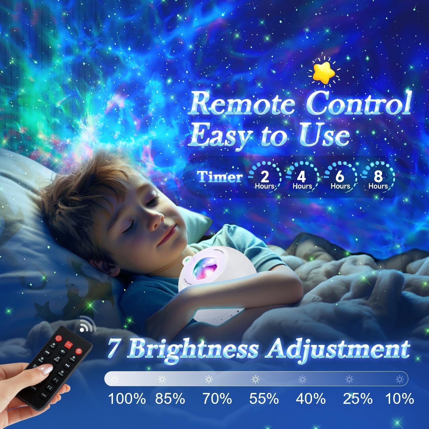 ⏲️【Remote+4 Timers+7 Brightness Levels Kids Night Light Projector】Galaxy night light projector for bedroom lighting operates not only with the buttons of the star projector for kids itself,but also with the remote control by long distance,changing colors,adjust brightness,move speed,turn on/off.The galaxy projector for bedroom adults has 7 brightness modes,so u can adjust the brightness of the stars for ceiling according to the occasion of use,so that yr eyes feel the most comfortable.With the 2/4/6/8h auto off timer for star lights for ceiling projector,u don’t have to worry about the galaxy night light projector staying on all night when u want to fall asleep,just set the auto off timer!