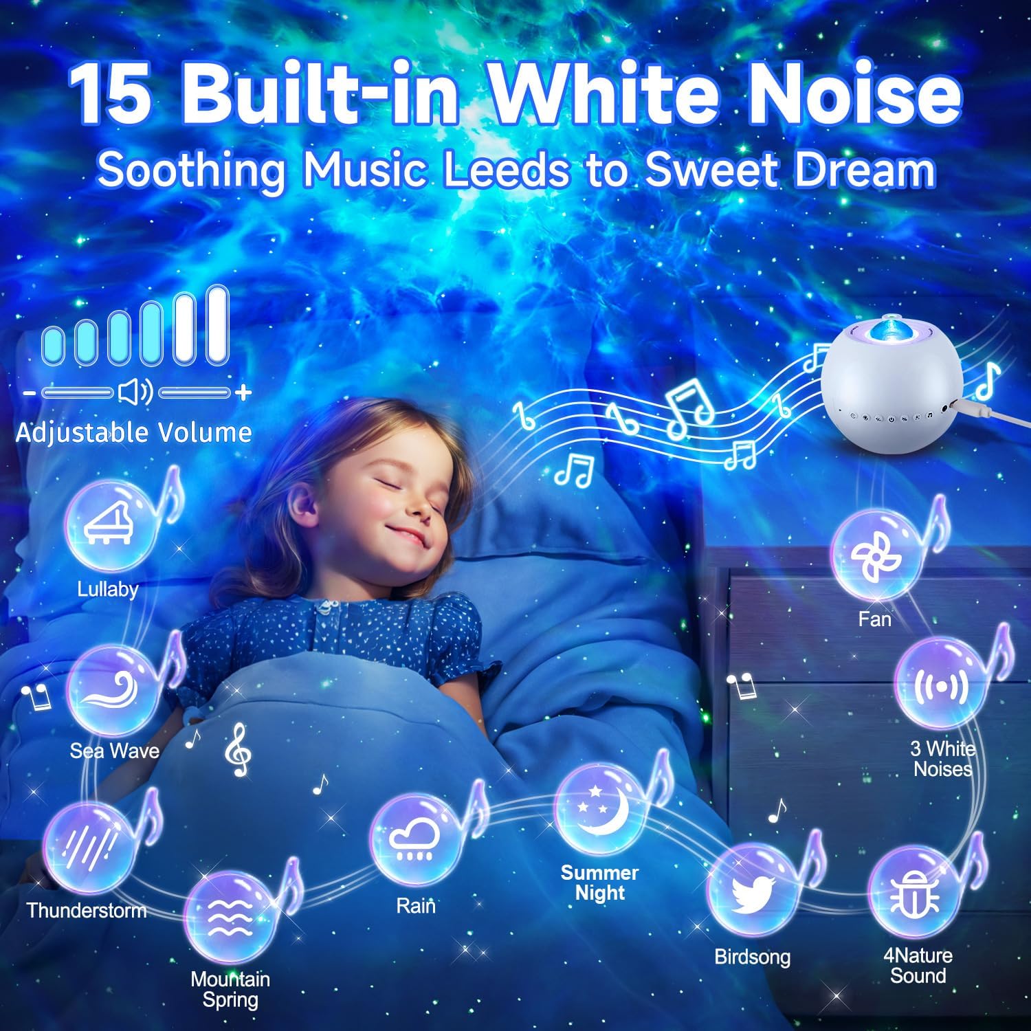 15 Built-in White Noises & Soothing Sounds