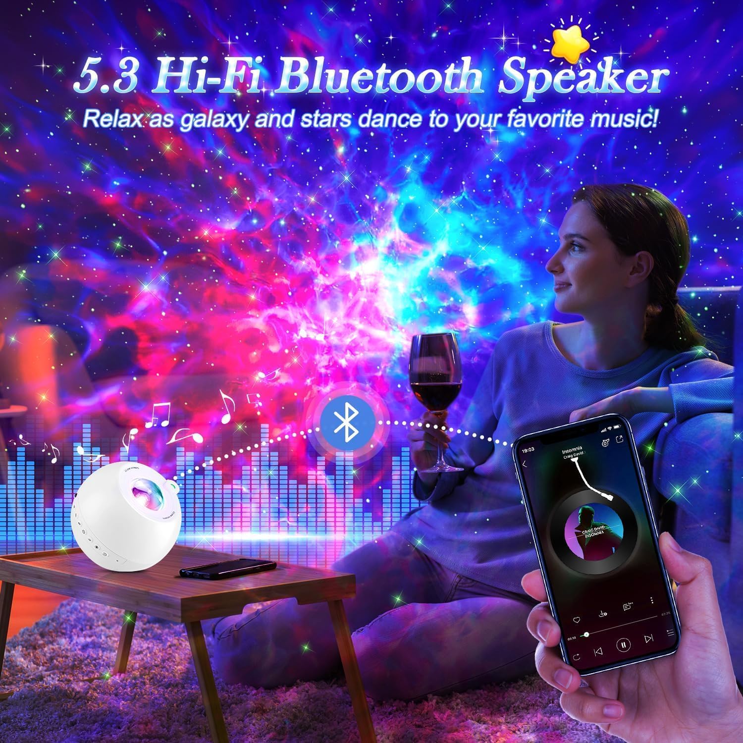 Star projector galaxy light projector for bedroom+Star lights for ceiling projector light+White noise machine+ HiFi Bluetooth speaker+Remote control