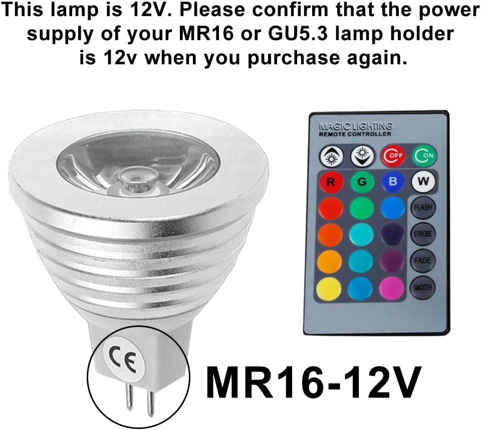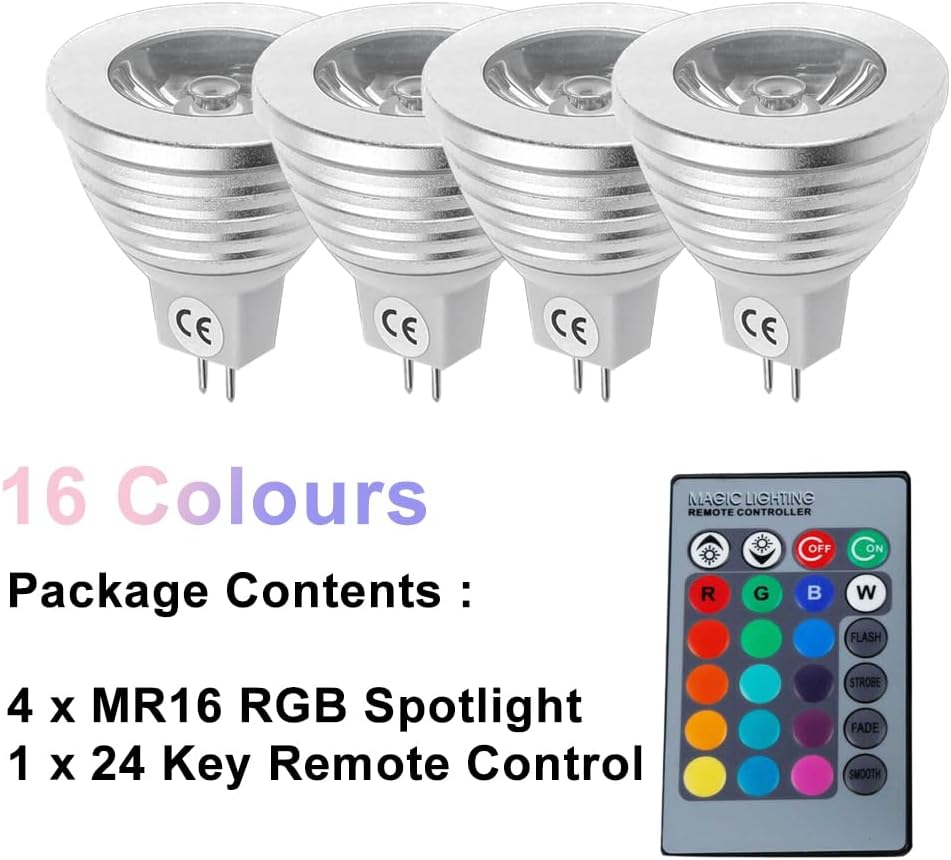 Package Contents 4 x MR16 RGB Spotlight ,1 x 24 Key Remote Control Voltage: DC 12V Material Die-casting Aluminum Application Home decoration, Hotels, clubs, shopping malls decoration, Architectural decorative lighting, Boutique atmosphere lighting, Illumination of emporiums, meeting room, factory, light box, Backlighting, concealed lighting, channel letter lighting
