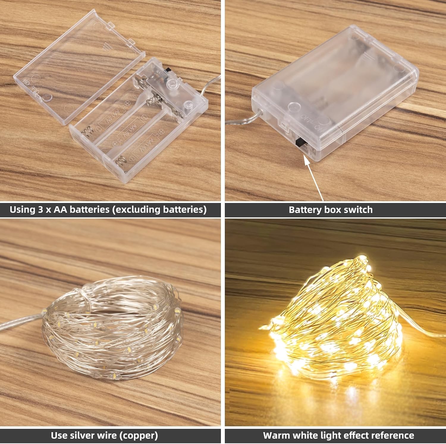 High-Quality Material: This exquisite string of lights features a durable 3xAA battery box, ensuring long-lasting illumination. The copper wire is flexible and strong, allowing you to shape and bend it around any object for creative decoration.The string lights come with a clear, flexible cord and an easy-to-operate battery box, making installation a breeze. You can effortlessly wrap, hang, or drape the lights around trees, along walls, or over furniture. The simple on/off switch and mode selector on the battery box mean you can change settings without hassle.