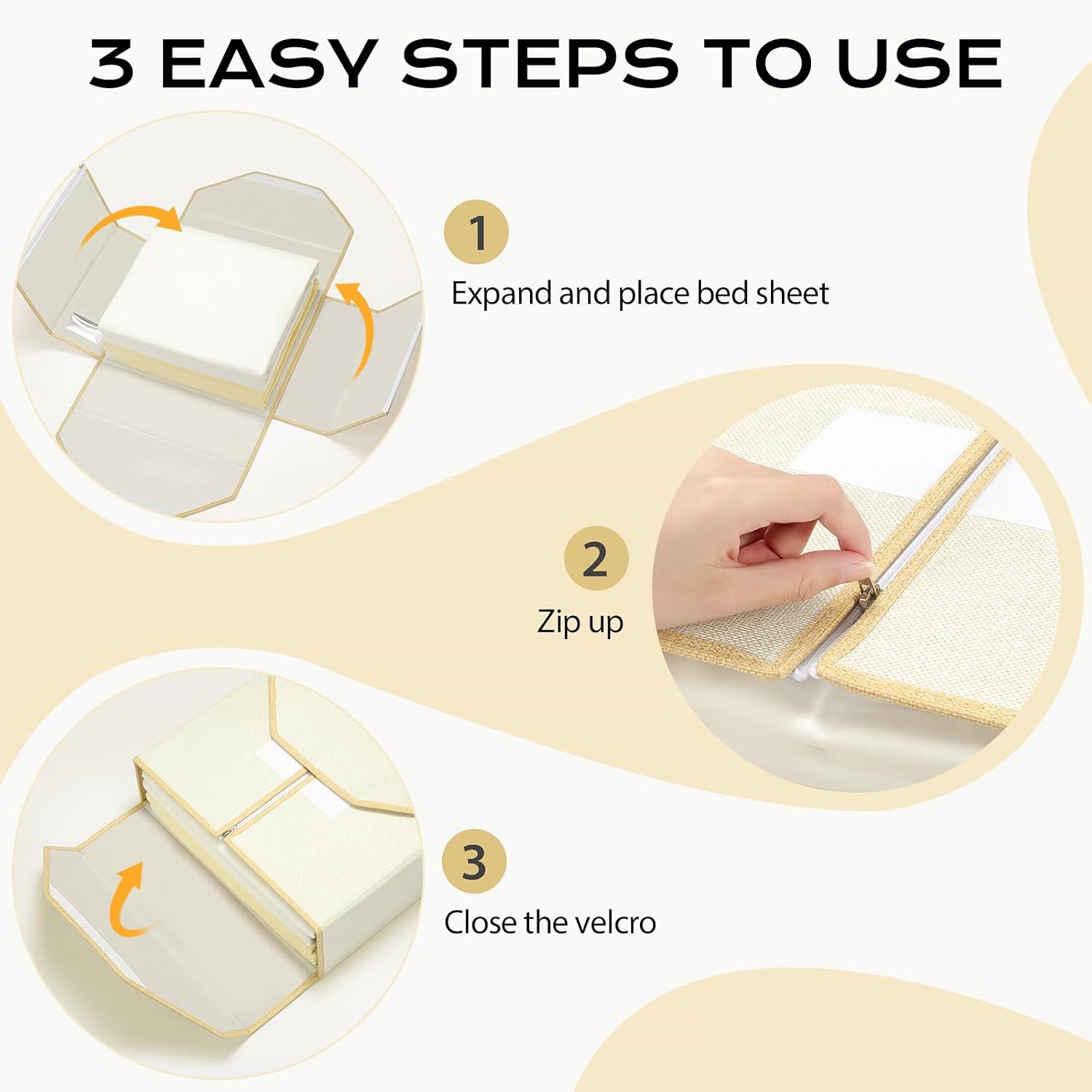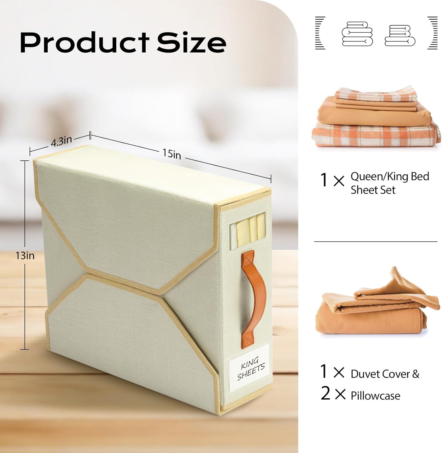 Ideal Size for Various Uses – This folding sheet set organizers and storage measures 15 “L x13” W x 4.3″H fitting queen/king size sheets, a duvet cover, towel and blankets, perfect for bedrooms, closets, coatrooms, apartments, dorms, turning your home bedroom closet organization and storage into an aesthetic work