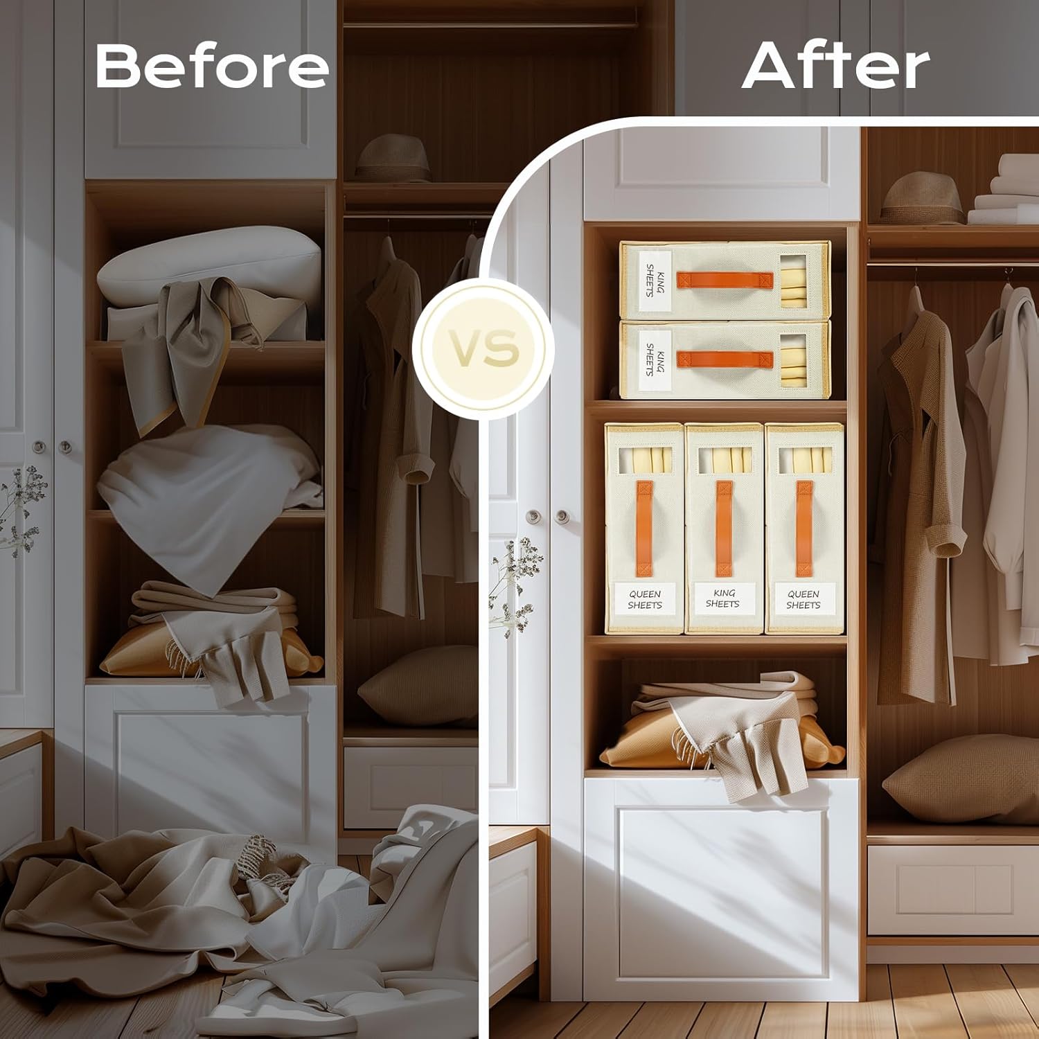 Sturdy & Practical: Designed with sturdy linen and accented with PU leather handles, our sheets organizer for linen closet is both practical and stylish. The handles offer a comfortable grip and add a touch of elegance to your storage solutions, making your home look chic and organized