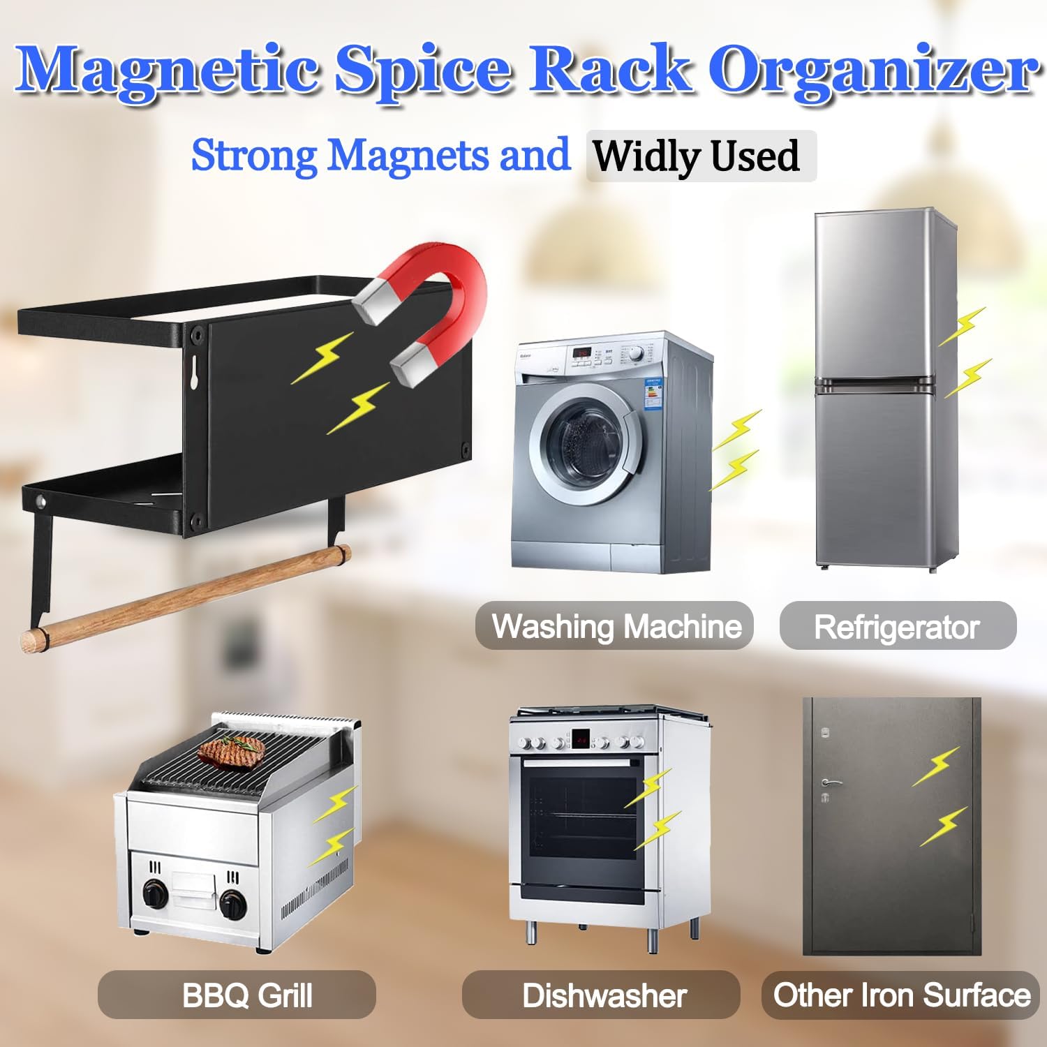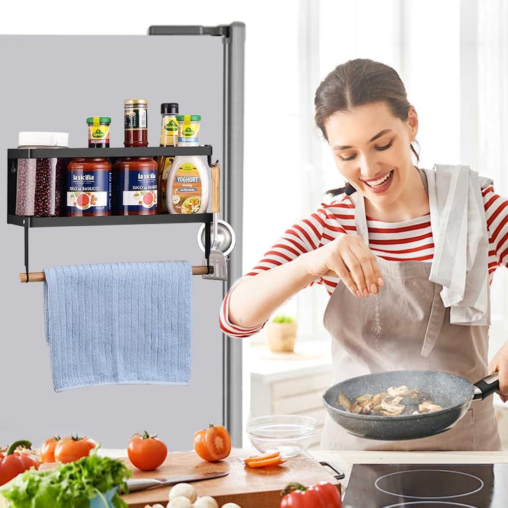 Say goodbye to drilling or nailing! Our spice rack comes with high-grade magnets that securely adhere to any magnet-absorbing surface, such as fridge doors and washer walls. No more cluttered countertops or searching through cabinets.