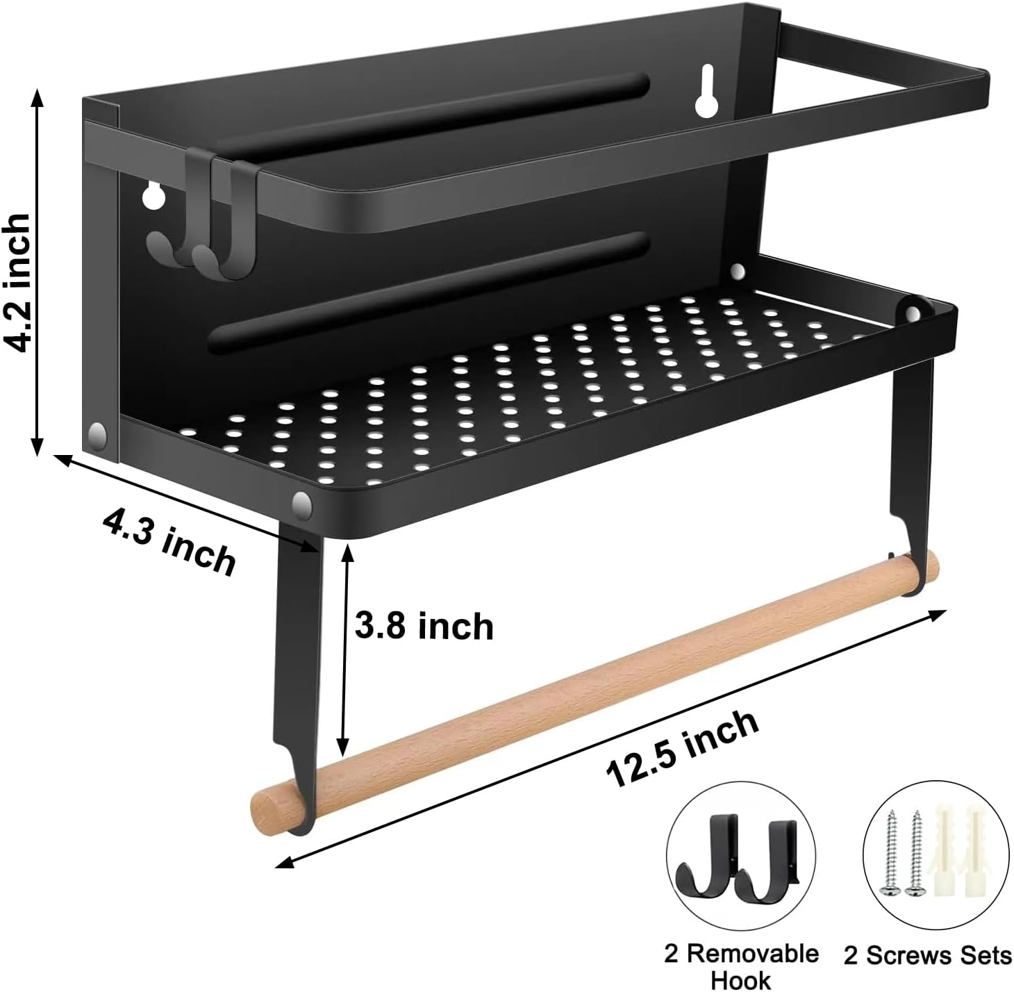 This holder comes with 1 removable wood rod and 2 movable hooks, providing multiple storage options for various items.Easily hang paper towel rolls for quick and easy access while cooking or cleaning.