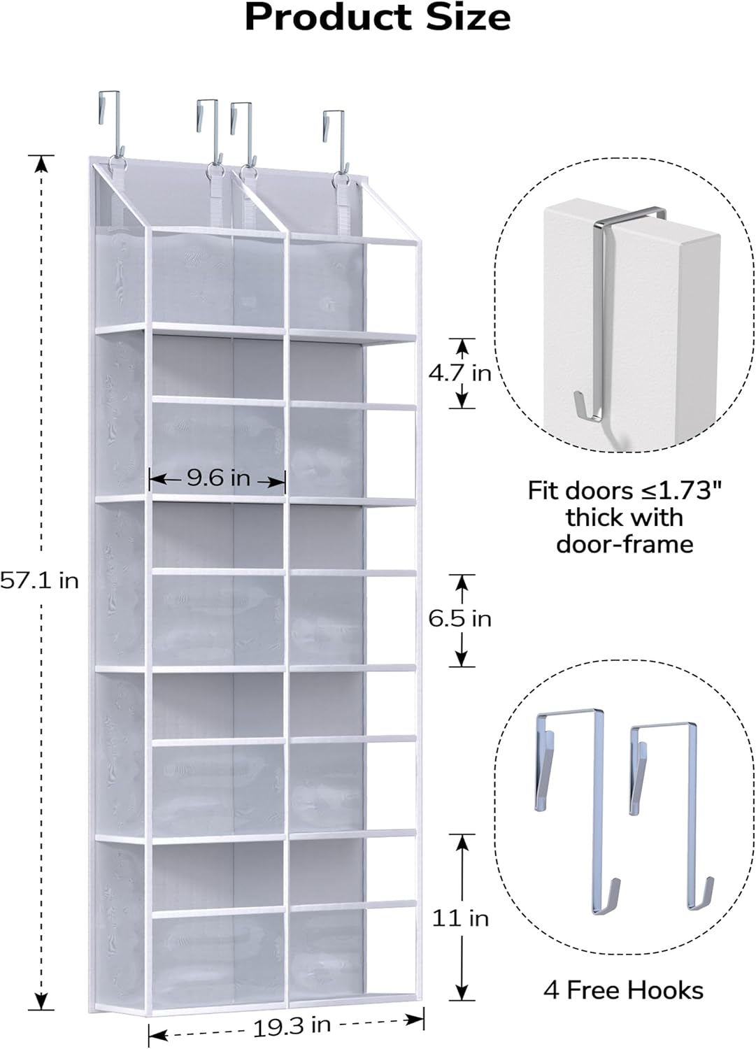 1. Crystal-clear pockets eliminate the hassle of searching—find what you need in a flash! 2. Dual-tier system (10 pockets) creates instant visual sorting – see & grab essentials in seconds. 3. Maximize your vertical storage space and keep everything neatly organized! 4. Built to last with thick, premium material—quality you can feel, durability you can trust! 5. Extra-large capacity—holds all your essentials and more! 6. Soft, safe kids’ room essentials—prevents bumps and bruises. 7. Dimensions: 57.1″H x 19.3″W x 6.5″D | Total with hook: 63″H. Please ensure the height and depth fit your door before purchasing.