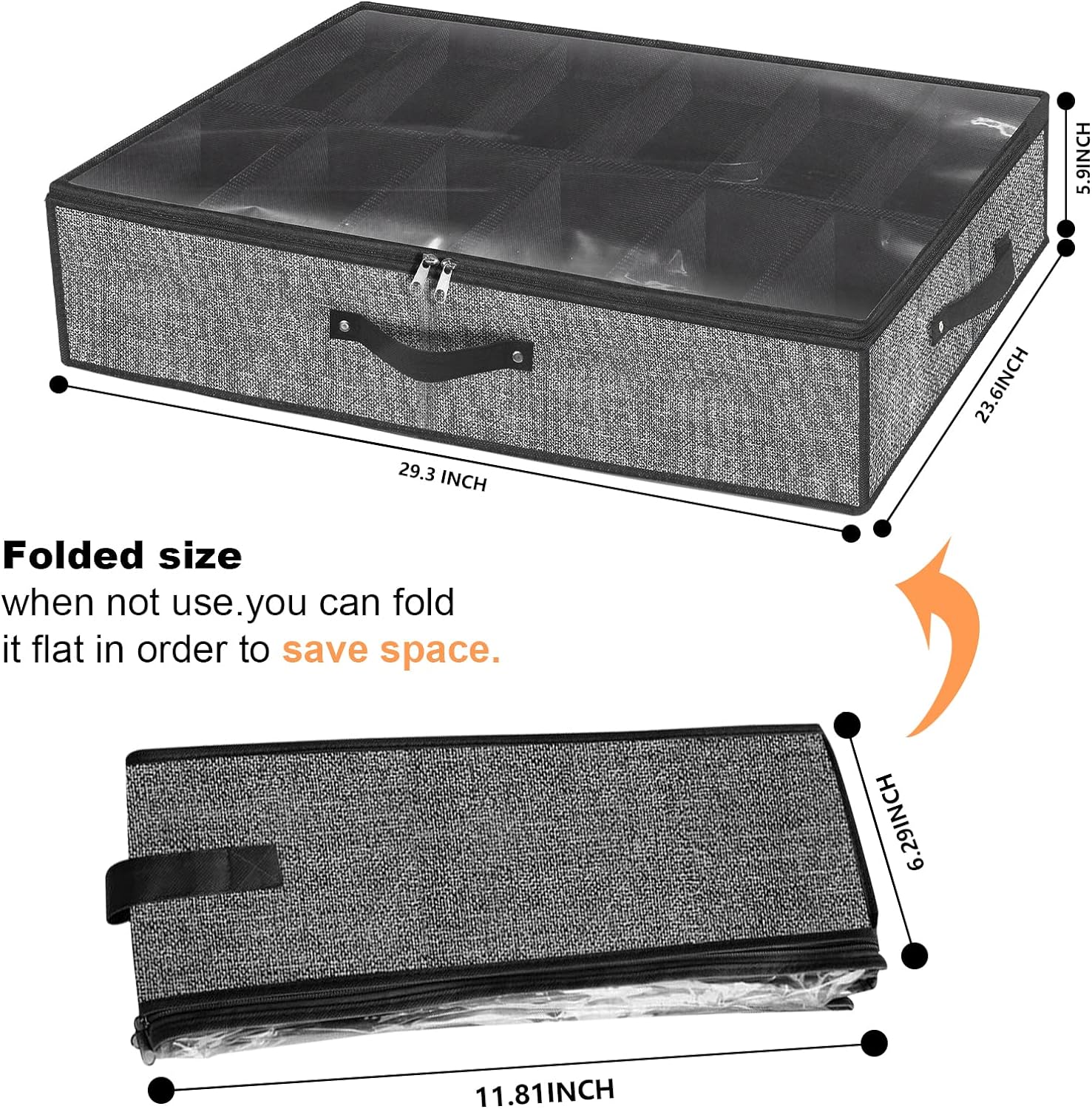 Sturdy Premium ECO Friendly Material:The underbed shoe box made breathable durable non-woven fabrics allows items air flow keeping them fresh and the cardboard keep the shoe box sturdy,fits 12 pairs of shoes.The whole under bed shoe storage measures 29.3 x 23.6 x 5.9 inches.