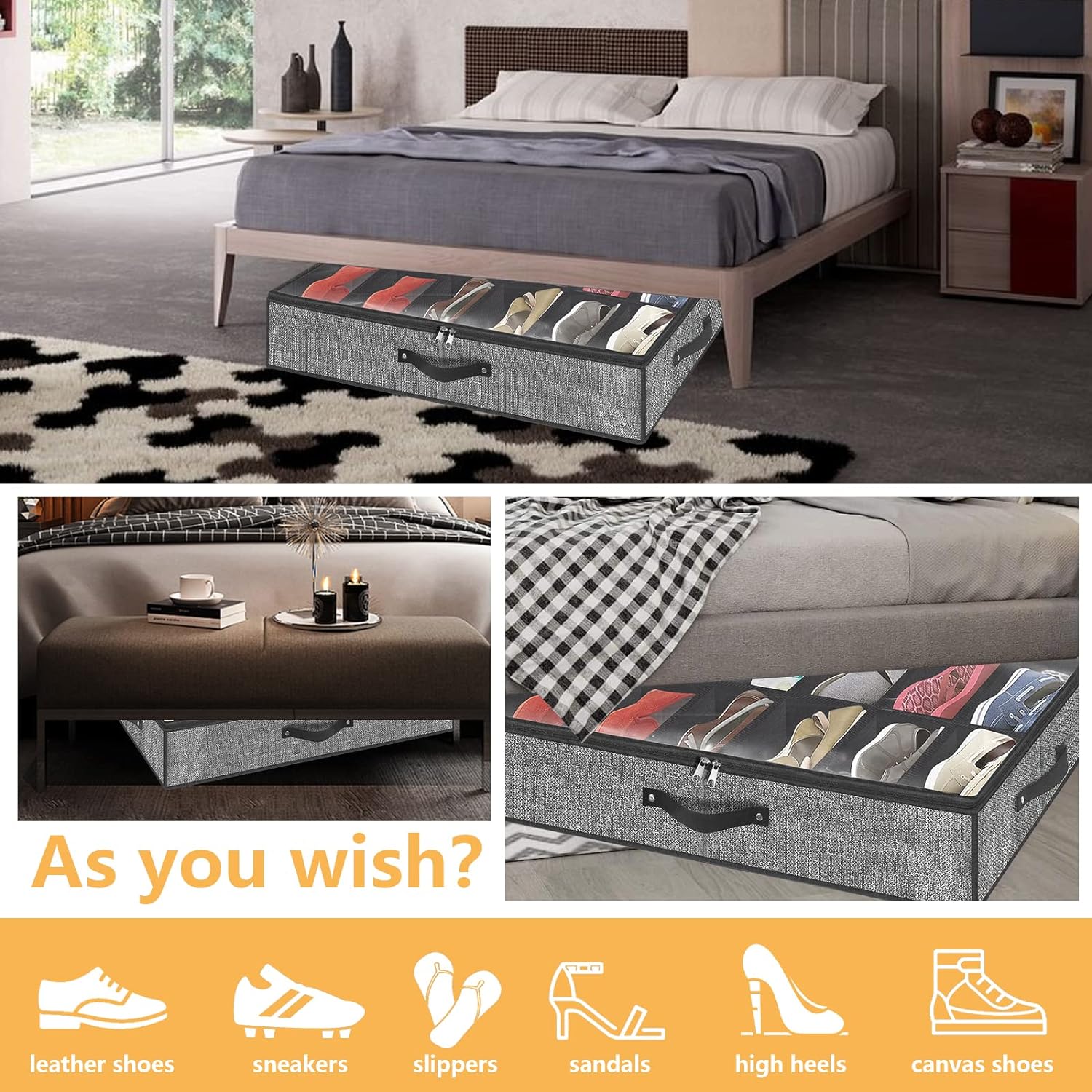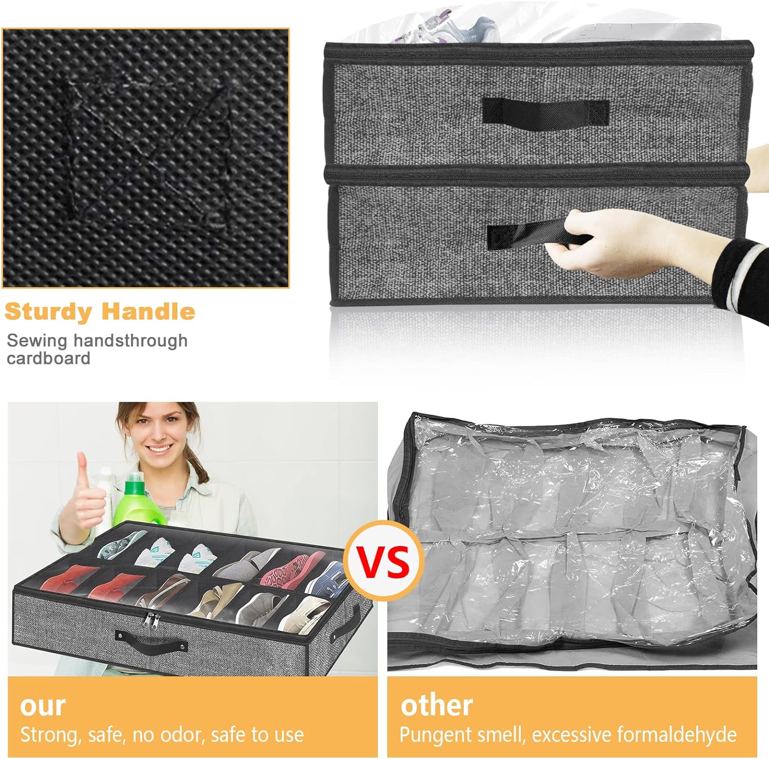 Perfect to Slide Under Your Bed:One handle on the front side and another handle on side allows you to easily pull it out in any direction.The shoe organizer with stiff cardboard insert which helps when pushing box under bed and the shoe box can stand on its own empty,The sides are attached which made it sturdier.