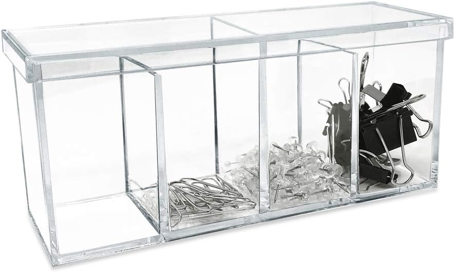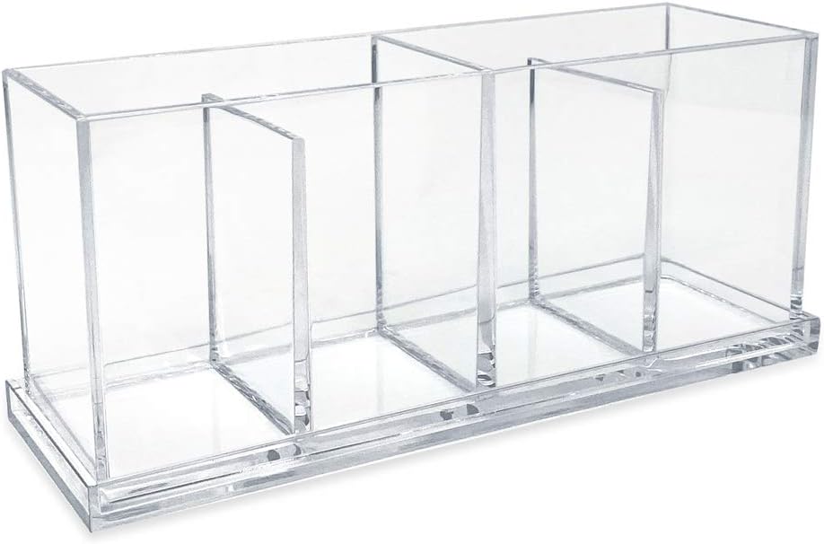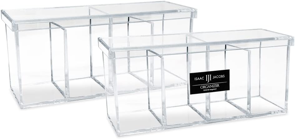 These Isaac Jacobs Large 2-Pack 4-Compartment Clear Acrylic Organizers are an ideal multi-purpose storage solution that will help de-clutter any countertop in the home. With their see-through appearance, these sectional organizers blend in beautifully with the décor of any bathroom or kitchen. Fill each compartment with long makeup and cosmetic accessories. These organizers are built with high quality Lucite material and each has a sturdy lid to keep your items dust-free. These makeup holders were made to bring order to your vanity. Stand makeup brushes, eyeliner, eyebrow pencils, mascara, and lip gloss in any of the deep slots. Give thin toiletries and narrow grooming accessories a home in each compartment. Divide toothbrushes, from makeup brushes, cuticle scissors, and emery board nail files with these stylish, acrylic organizers. Arrange daily beauty accessories like hairbrushes, bobby pins, small hair clips, cotton swabs and rounds in the deep compartments. Organize school essentials and home office items, like pens, pencils, crayons, markers, erasers, or small binder clips in these multi-sectional organizers. These efficient organizers will also be put to good use in the kitchen to maintain a clean counterspace. Stand silverware and reusable straws in any of the attractive slots or turn these stylish holders into a chic spice rack. Create a coffee station by lining the deep sections with sweetener, stirrers, straws, and teaspoons. Arrange school and art supplies in these transparent organizers. Store pens, pencils, crayons, markers, scissors, and glue sticks neatly. Mini glitter bottles and colored tape rolls will look striking in these organizers. You will enjoy how these handy, multi-sectional organizers keep the items you grab every day in order and within reach. [NOTE: DO NOT USE WINDOW CLEANER ON ACRYLIC] [Overall Dimensions with Lid: 9” L x 3” W x 4” H. Individual Compartments: 2” L x 2.5” W x 3.75” H]