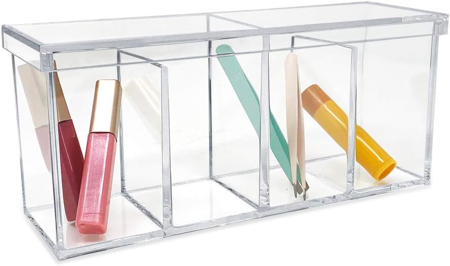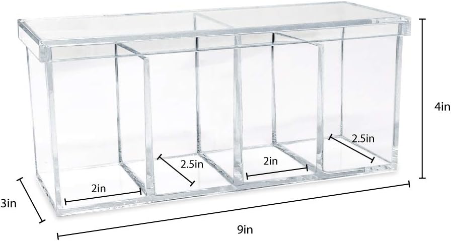 HIGH QUALITY: These organizers are built with durable Lucite material. Your daily necessities will always be visible so you can grab items when you are on the go. These compact organizers are light and sturdy, each with a clear lid to keep it clean from dust. Their see-through shine can be maintained by wiping with a cloth or paper towel. [NOTE: DO NOT USE WINDOW CLEANER ON ACRYLIC] [Overall Dimensions with Lid: 9” L x 3” W x 4” H. Individual Compartments: 2” L x 2.5” W x 3.75” H]
