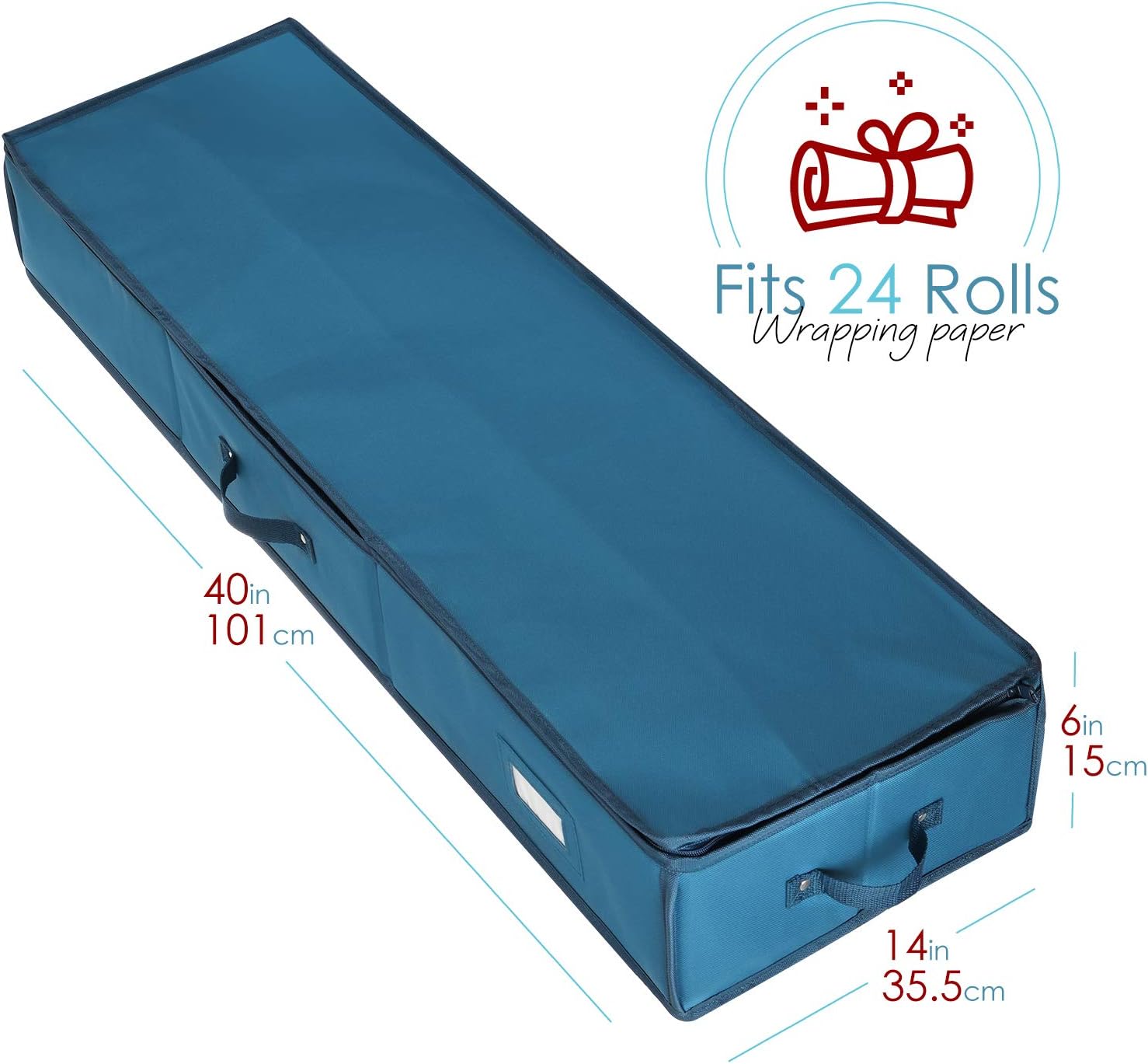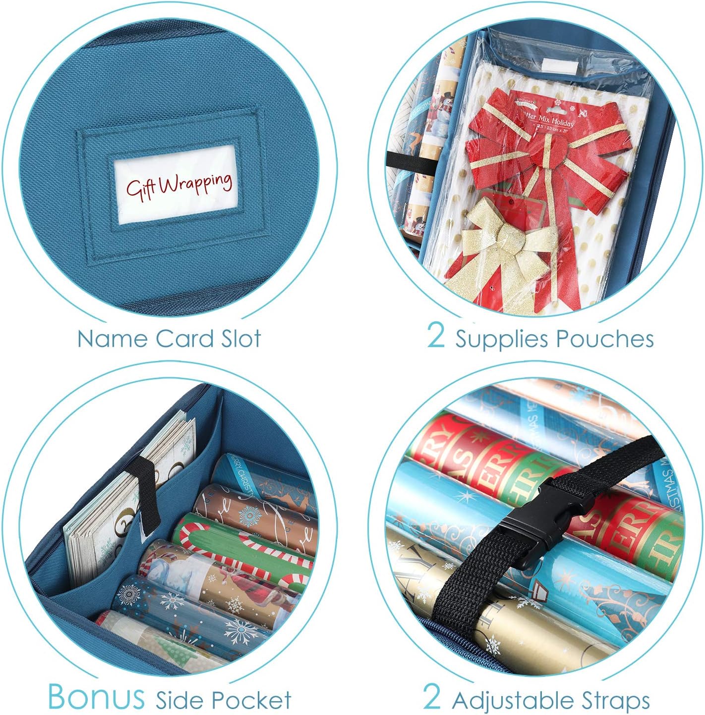DURABLE CONSTRUCTION – gift wrap organizer storage made of ultra-durable, 600D Oxford-polyester fabric. Body is tear, puncture, water, fade, and moisture resistant. Heavy-duty cardboard construction keeps the Xmas gift wrap organizer structured and strong.