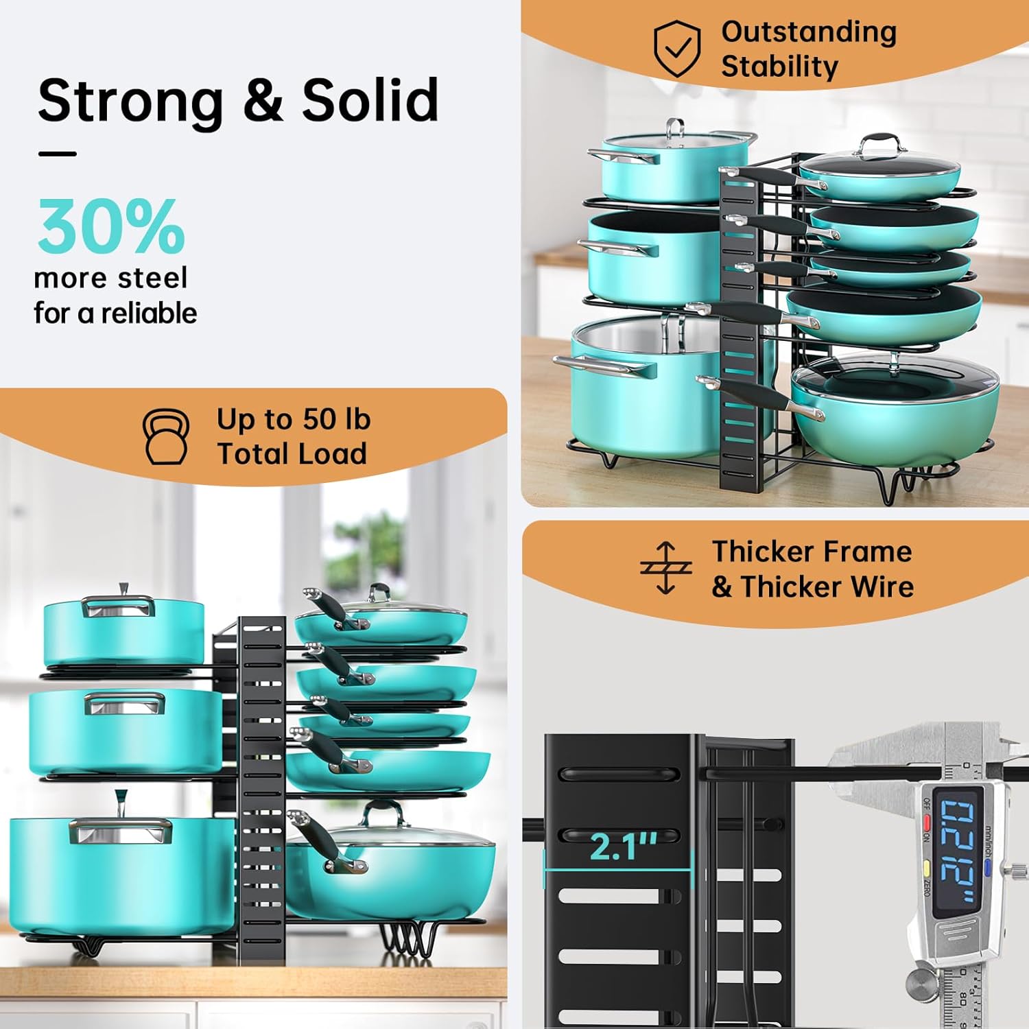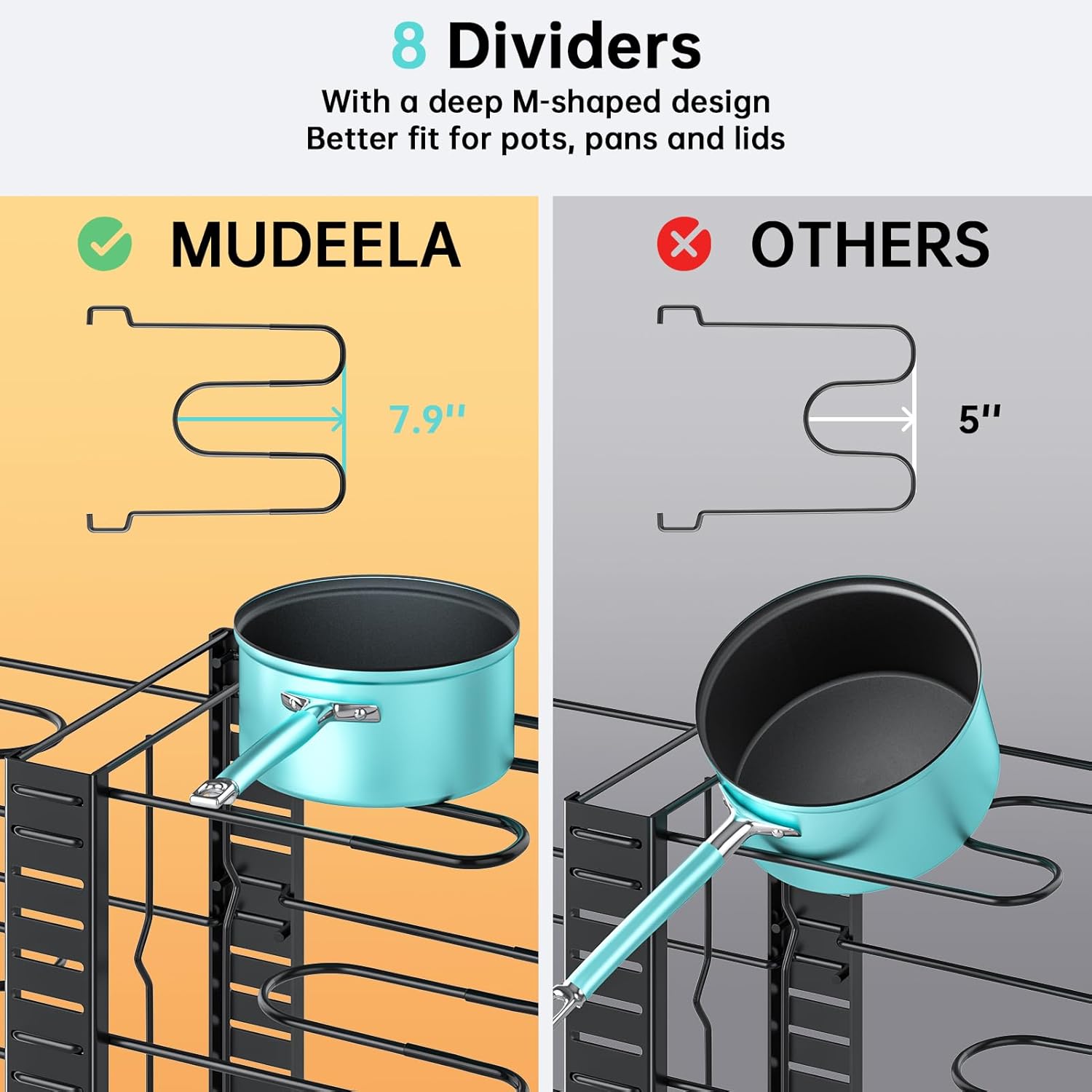 【Large Storage Capacity and Compact Size】MUDEELA pan organizer rack for cabinet has 8 tiers; allowing you to store 8 and more stacked pots and pans; The compact design saves you a lot of valuable space in your kitchen cabinets pantries and on your countertops
