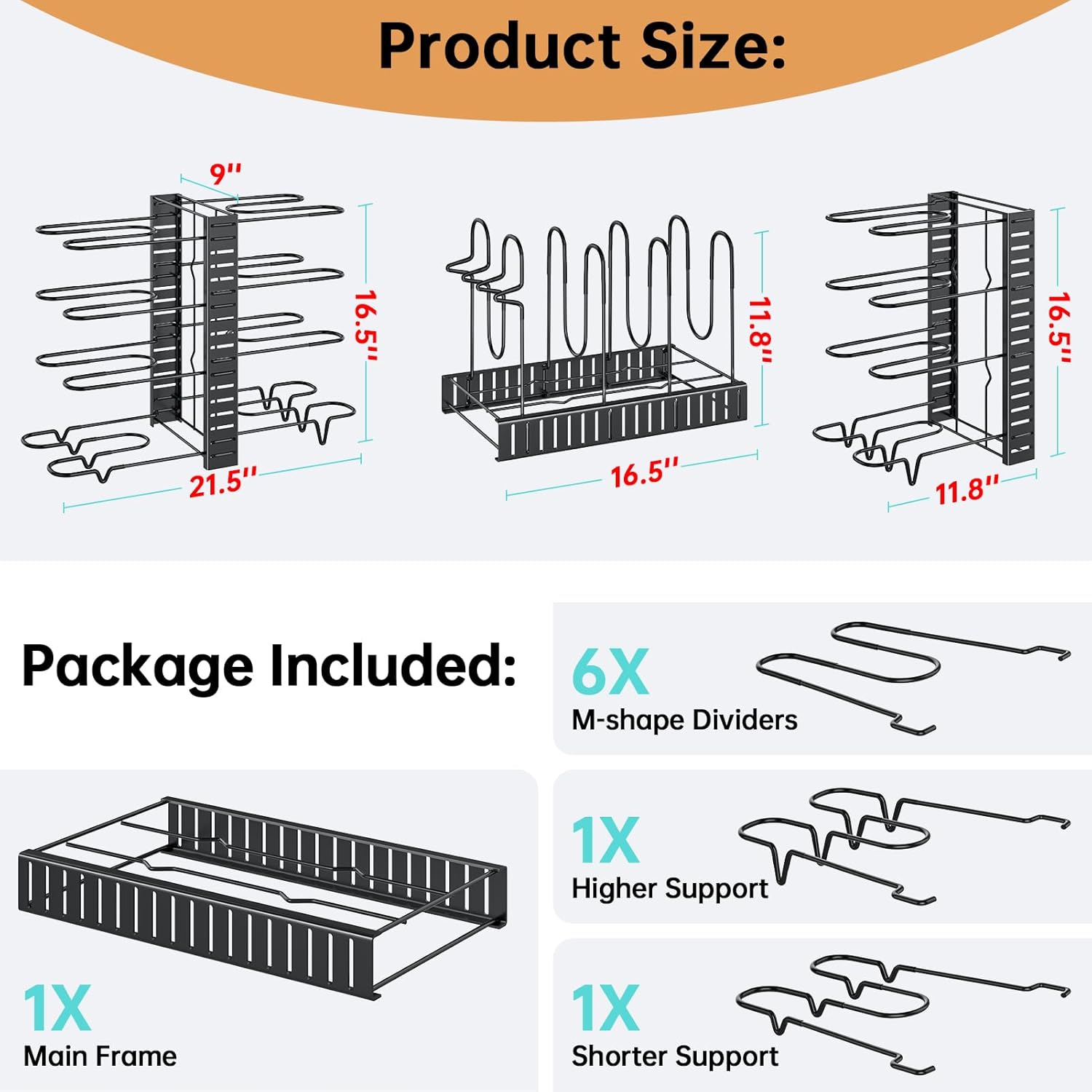 【Adjustable Design】MUDEELA pot pan organizer features adjustable dividers, allowing you to customize the position of each divider to accommodate pots and pans of different sizes. By adjusting this pot and pan organizer, you are free to maximize the space of your kitchen cabinet organizers and storage according to your needs