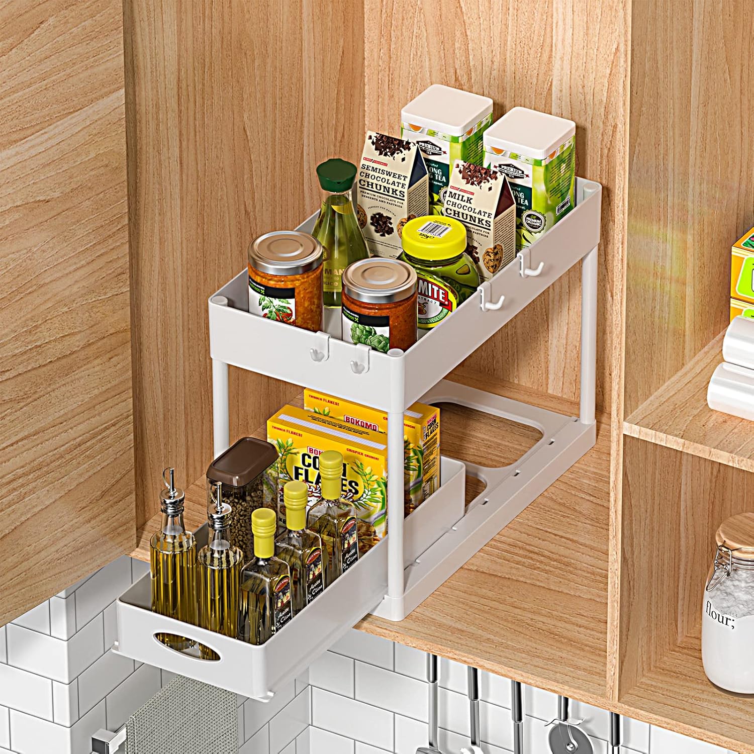 👍 Multi-purpose Under Sink Storage: Perfect fit the under sinks, bathrooms, cabinets, countertops, kitchens, food pantries, offices, and other places. Can be used as bathroom toiletries storage, kitchen spice rack or office supplies shelf, etc. Modern and stylish minimalist design can be integrated into most household styles perfectly