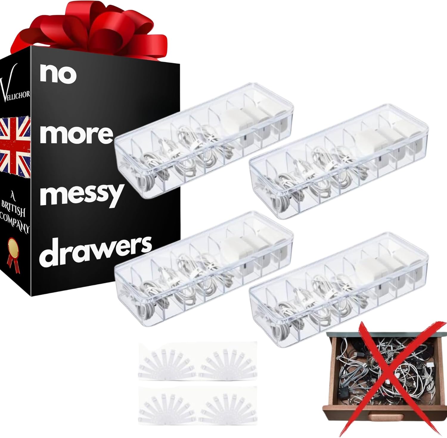 No more messy drawers! Comprehensive Cable Management Kit: This set includes four clear plastic cable organizer boxes measuring 10.2 x 3.9 x 2.4 inches each, along with 40 versatile silicone wire ties, providing an all-in-one solution for tidying up cables, cords, and small desk accessories. Keep your space organized and clutter-free with ease.