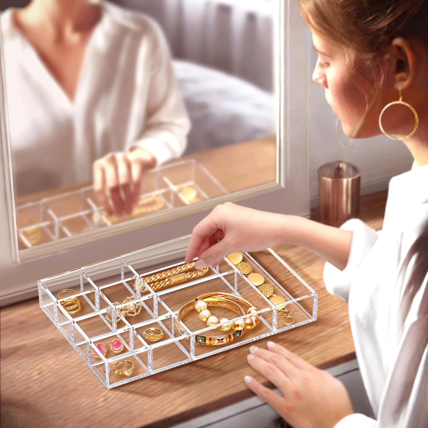 [GREAT STORAGE] Acrylic organizer for storing rings, earring, bracelets, necklaces, and more. Easily keep your trinkets and accessories organized in style. Perfect solution for organizing items and keeping the vanity neat and clean.