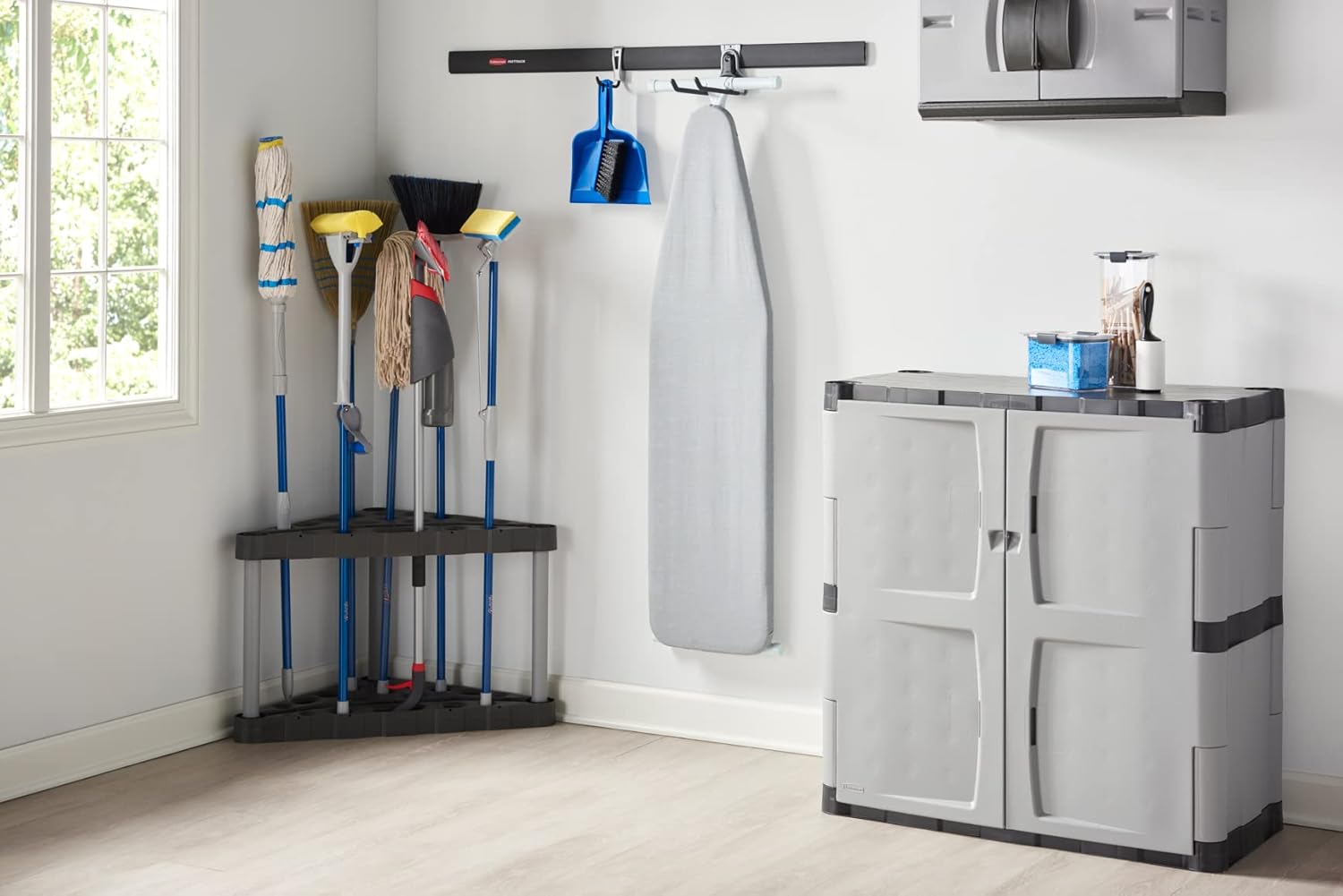 The Rubbermaid FastTrack Storage System is The Fast Way to Organize your garage. Equipped with rails, hooks, shelves and cabinets it’s an easy storage solution that can grow as life changes. This tool tower maximizes available space by creating storage in the corner. It holds up to 30 tools. It’s large base allows for greater stability, and it can be anchored to the wall for additional stability. It is easy to assemble and will not rust, dent, rot or peel.