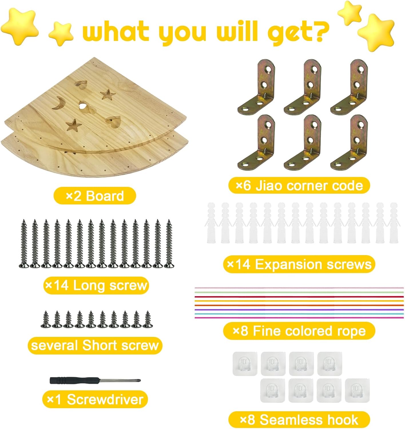 One set includes: one set = two wooden boards, 6 corner yards + 14 expansion screws + 14 long screws + 8 non-marking hooks + several small screws + screwdriver + 8 pieces of 1.5cm thin colourful rope
