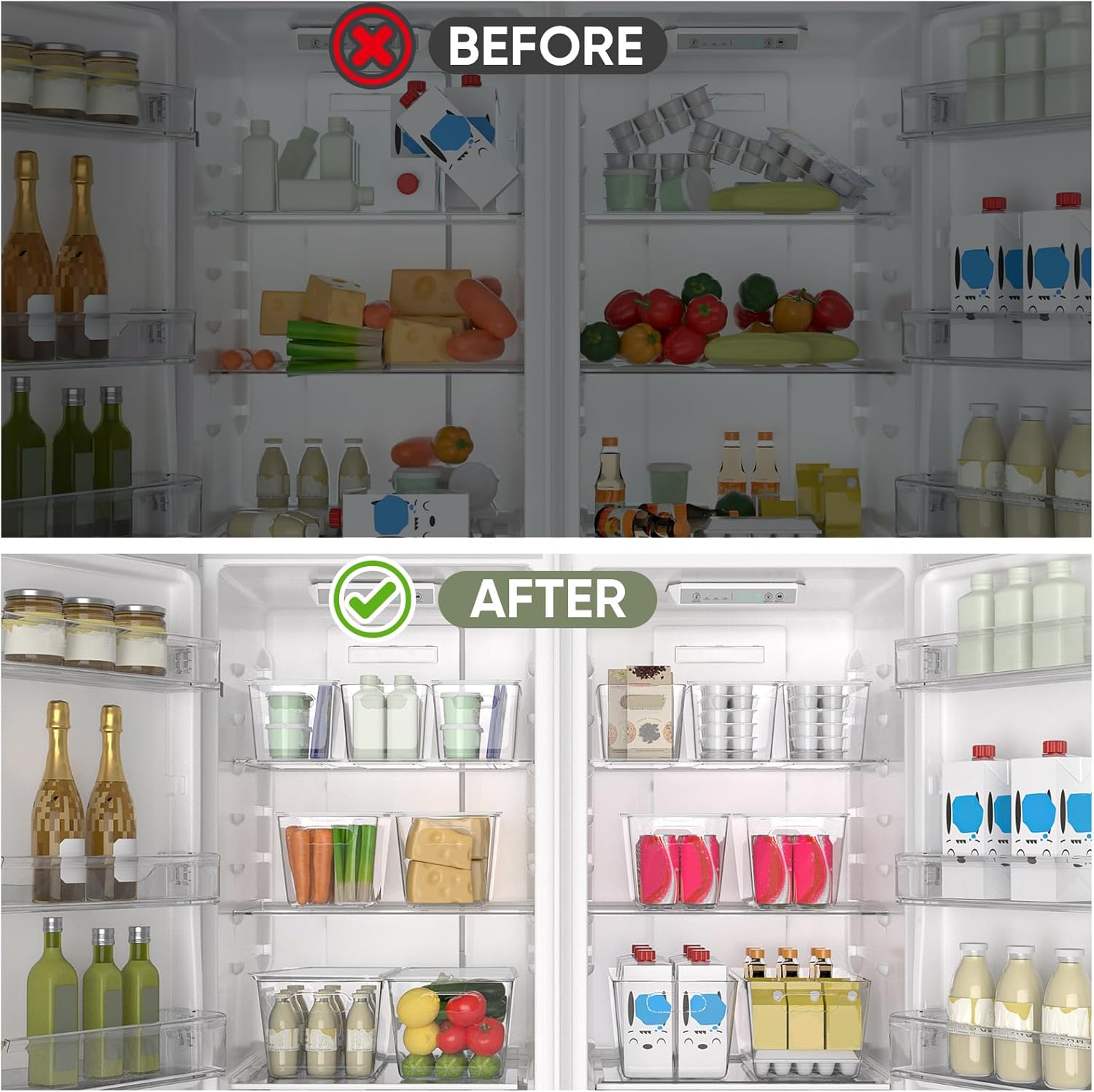 Stackable: These plastic storage bins are stackable, allowing you to maximize vertical space regardless of how many bins you use; The fridge organizer is made of high-quality PET material, which is strong and durable, quite clear so that you can access your items without looking for them