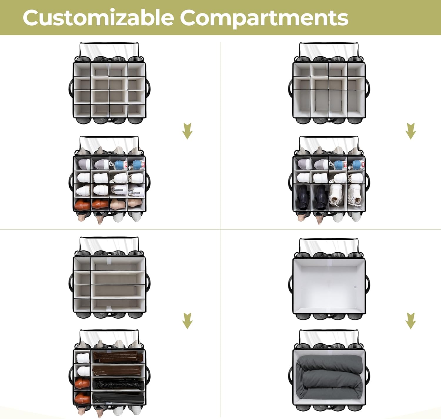 OPTIMIZE STORAGE SPACE: Large section design – Each section is 3.8 width and 5.3 length, effortlessly accommodate 16 pairs of shoes and a variety of household essentials, including handbags, blankets, and clothing. Ideal for bedrooms, garages, attics, basements, and dormitories. Side bag size is: 9.06 depth and 8.6 length, fitting up to 8 pairs of shoes