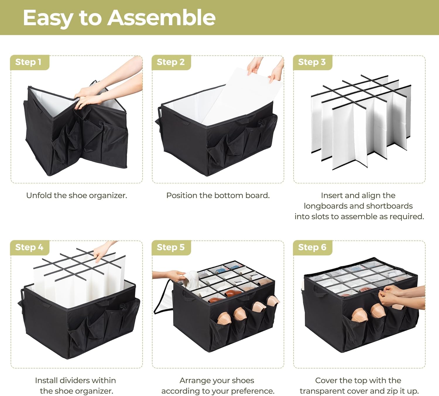 EASY TO ASSEMBLE AND MOVE: Our shoe box has clear instructions and straightforward steps ensure that putting the product together is a breeze. Featuring dual reinforced handles for effortless mobility, our shoe organizer can be conveniently relocated as needed. Its foldable design ensures simple storage when not in active use.