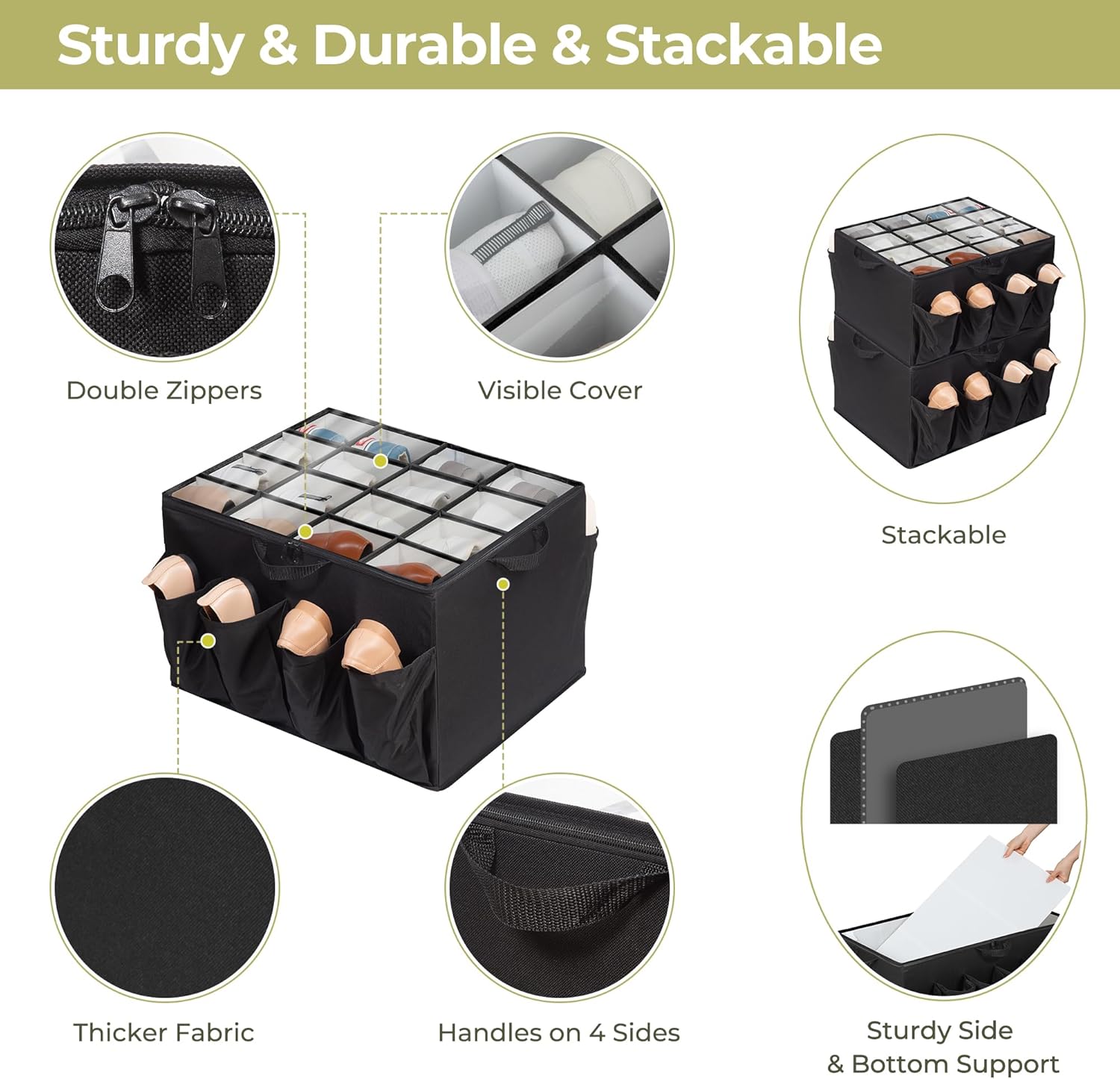 STURDY,DURABLE AND STACKABLE: Crafted from premium side boards and internal dividers, our shoe storage bins remain steadfast even when empty. Its exterior boasts resilient material, while the interior features a low-maintenance, easy-to-clean lining. Our shoe box organizers can be stacked securely without compromising stability or shape.