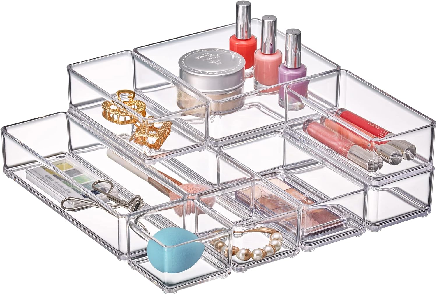 [IDEAL DESIGN] The organizers are modular and stackable for ultra space saving. Besides, the whole set includes organizers with various sizes for your mix and match, to meet your own need for your vanity or desk drawer.
