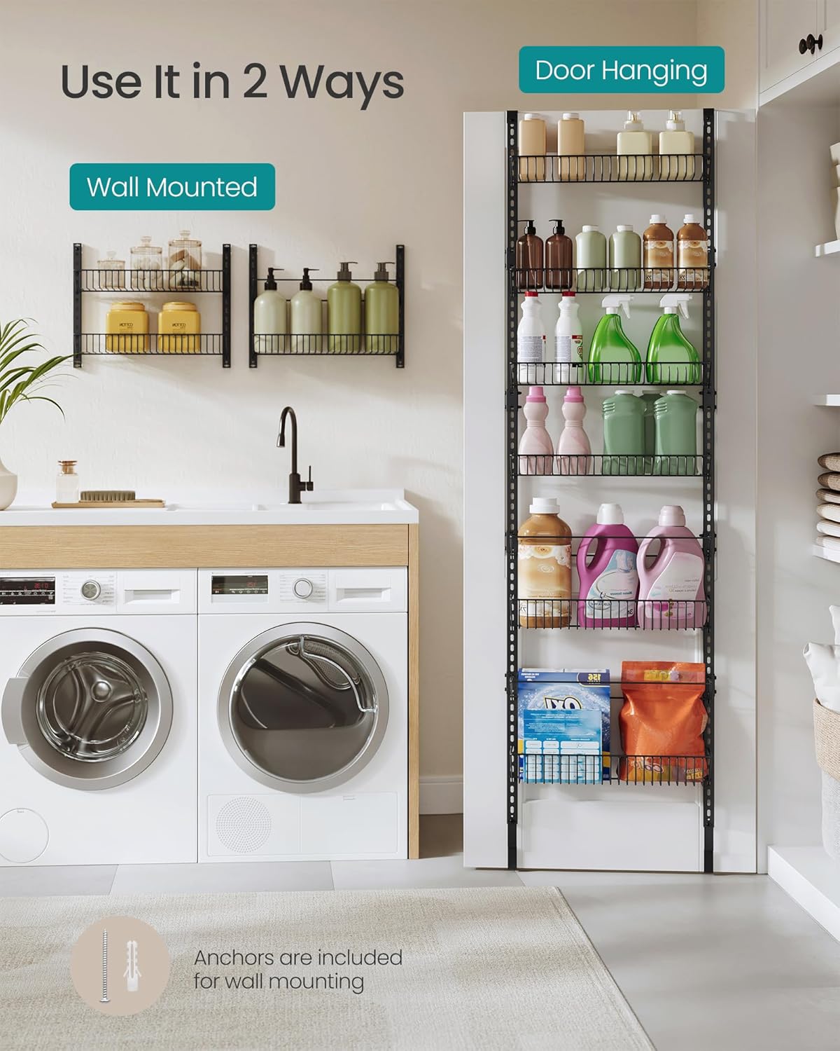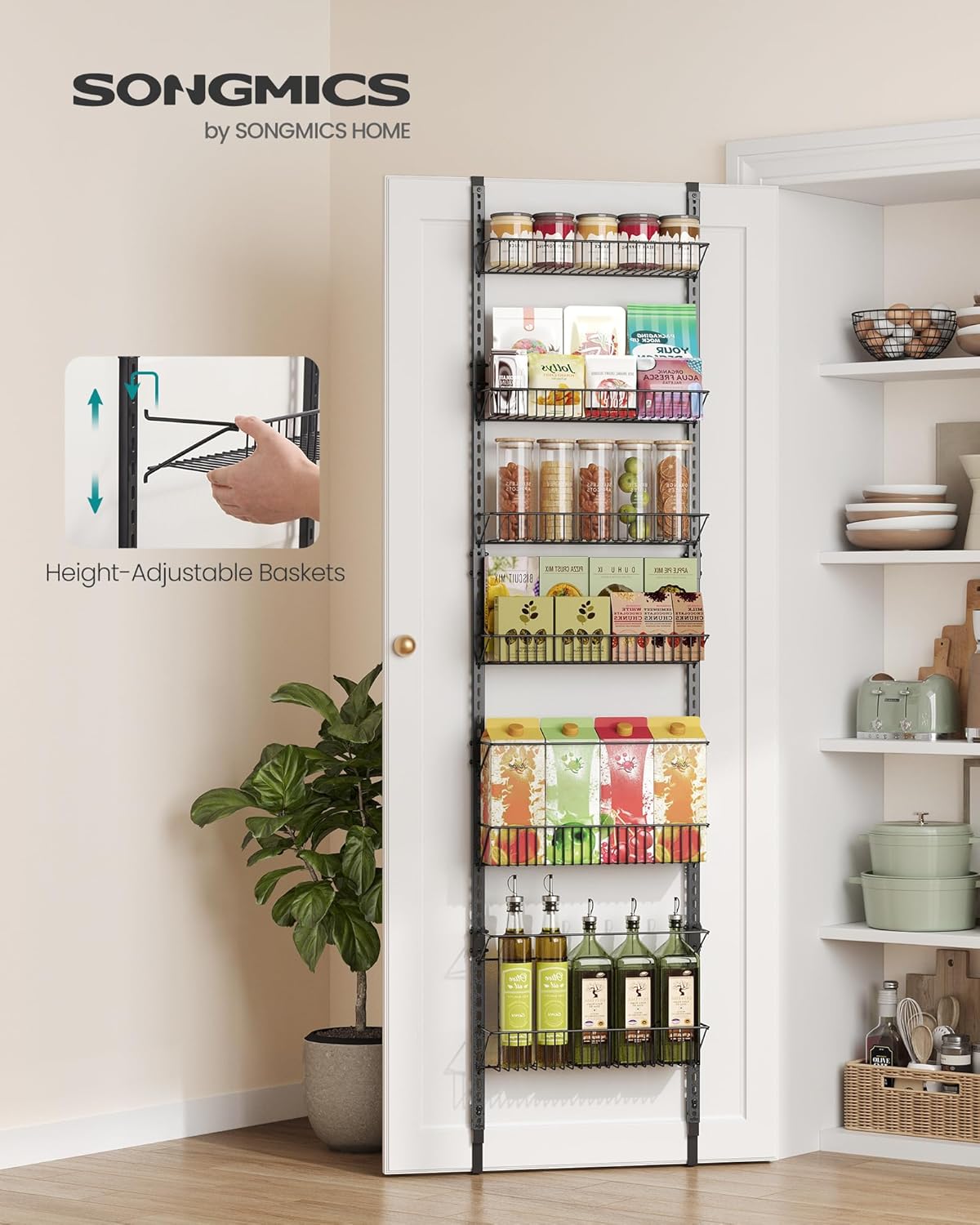 【MAXIMIZE YOUR STORAGE】Featuring 6 mesh baskets (2 tall and 4 short), this 6-tier over the door pantry organizer efficiently stores spices, cans, snacks, and other miscellaneous items, maximizing space utilization in limited areas