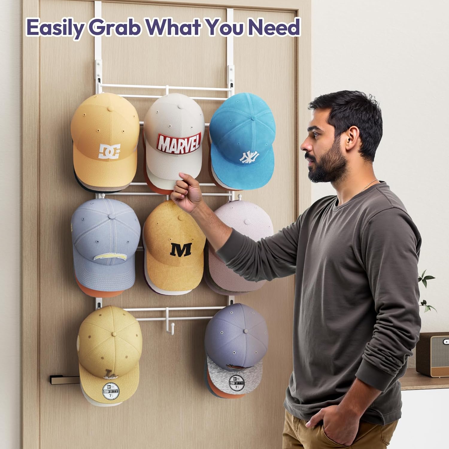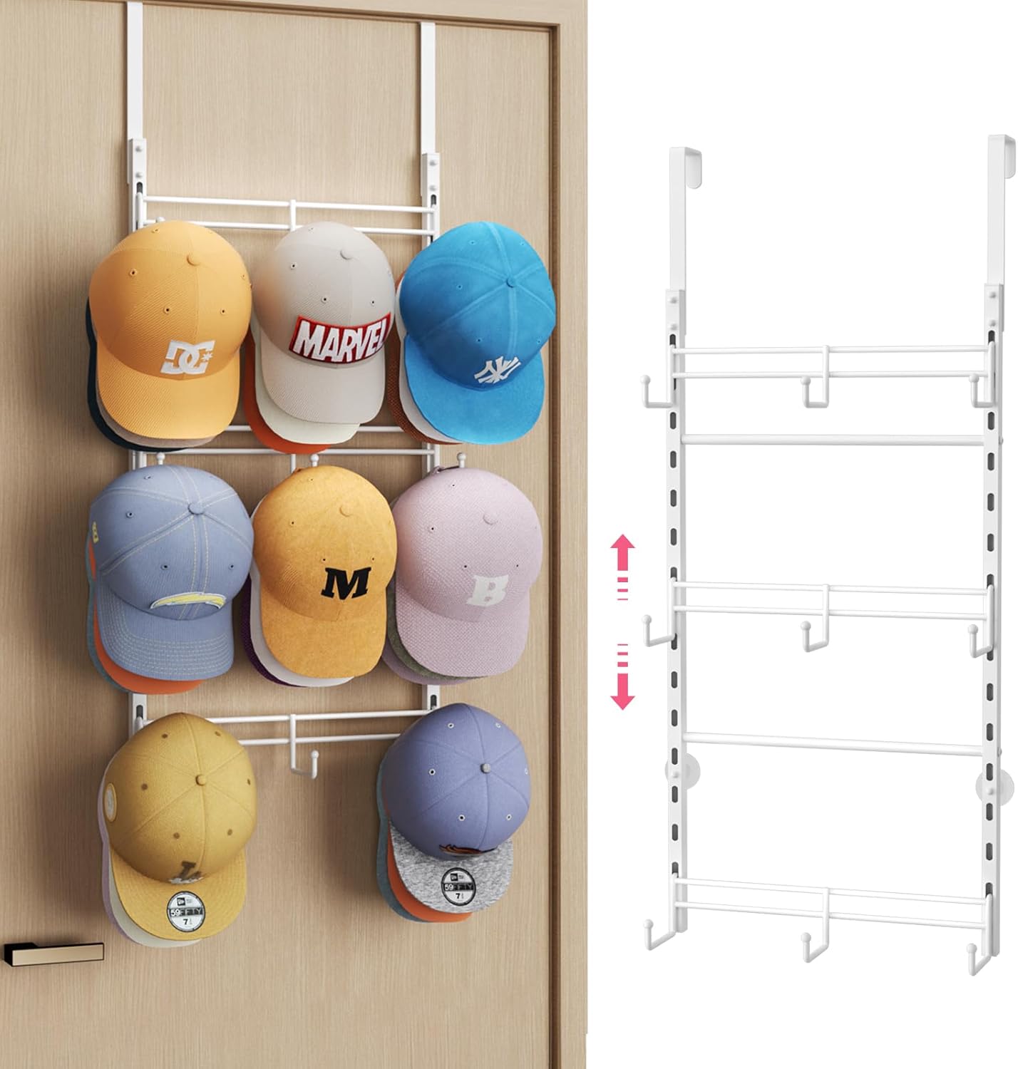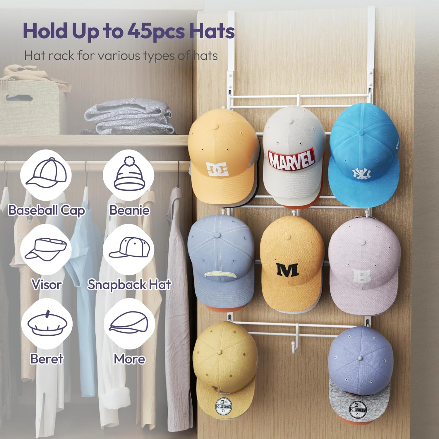 [Perfect for Home & Closet Use]: Designed to fit effortlessly over doors, on walls, or inside closets, this hat holder for close is a great addition to homes, dorm rooms, and apartments. No more messy piles – keep your hats displayed in style