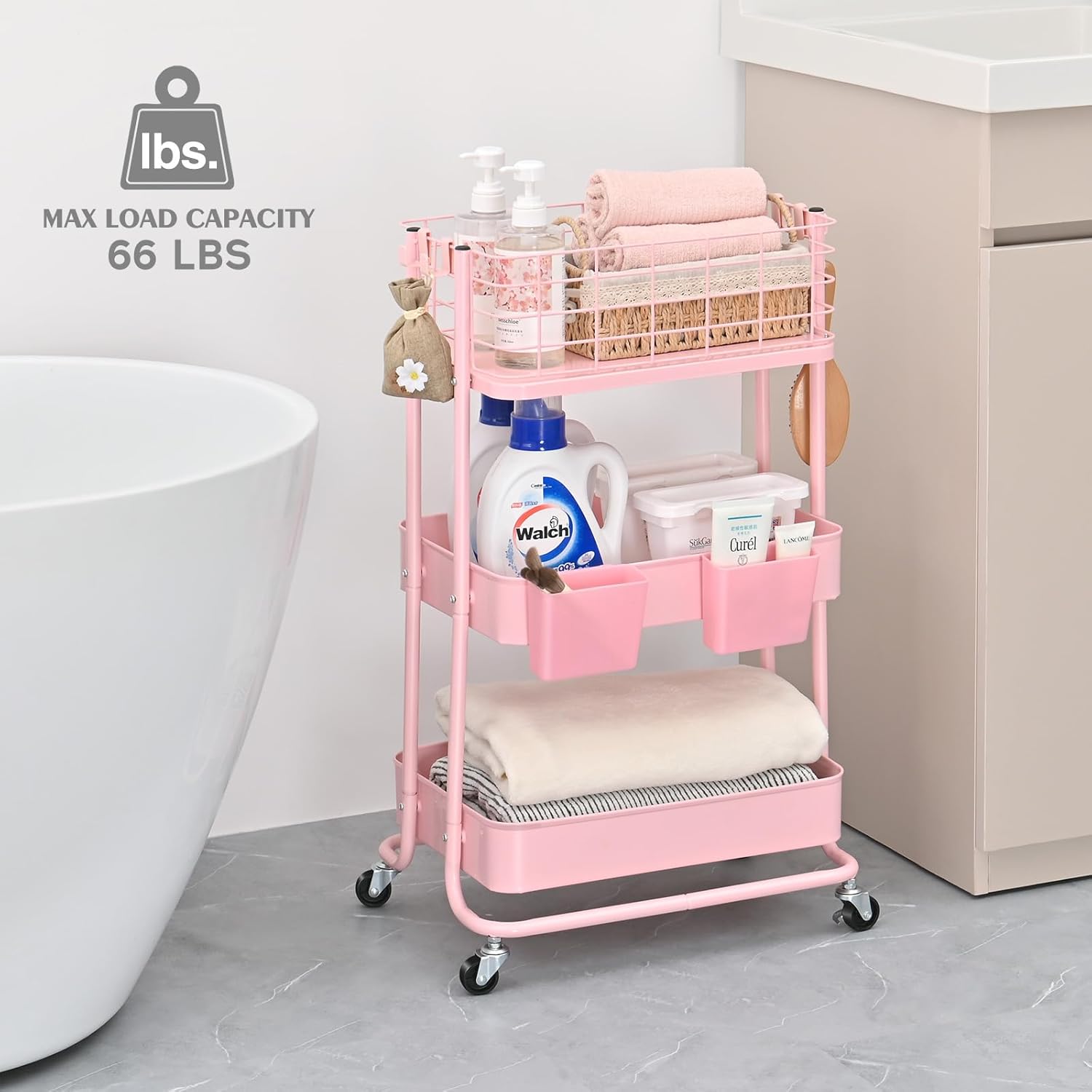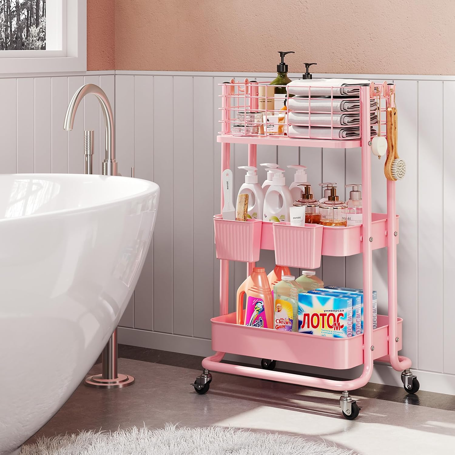 【Perfect Rolling Carts with Wheels】The rolling utility cart equipped with 4 360° rotating wheels, and two of them are lockable, Whether you’re navigating tight corners or moving through crowded spaces, this utility carts with wheels effortlessly adapts to various environments. Convenient for your storage.