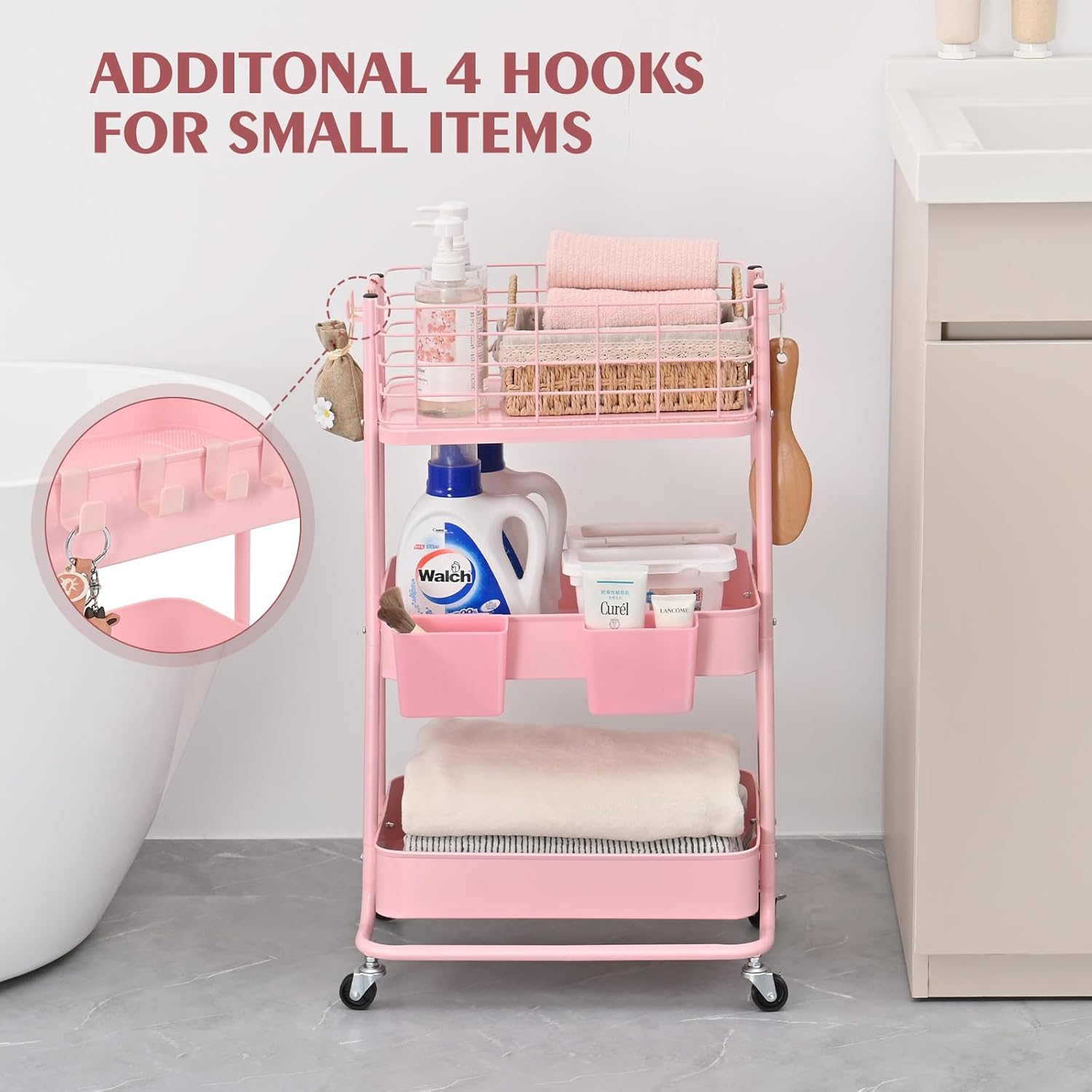 【Easy Installation】Each product comes with installation instructions, which are easy to understand. Within 10 minutes, you’ll have a multifunctional storage rolling cart organizer ready to streamline your tasks. The trolley with the two small plastic basket and four hooks, increase your storage. In addition, the number of accessories is indicated in detail in the manual.